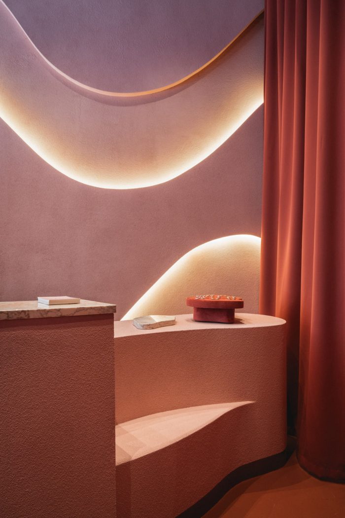 有特色的店面是根据20年代的建筑设计指令设计的。流线型的柜台,昏暗的摩洛哥粉色和赤土色,以及看起来像由沙漠沙子制成的墙壁,为珠宝创造了一个完美的背景,使KOPI的所有系列闪耀。这种类似沙漠的氛围主要是通过柜台后面的波浪形墙壁的摆放来实现的,这面墙是由艺术家们精心制作的,非常注重细节。它覆盖了一层厚厚的沙子,并涂上了哑光的矿物漆。墙壁上特有的凹陷类似于阿特拉斯山脉岩石的空洞,为花瓶和蜡烛的有机形式提供了完美的背景。