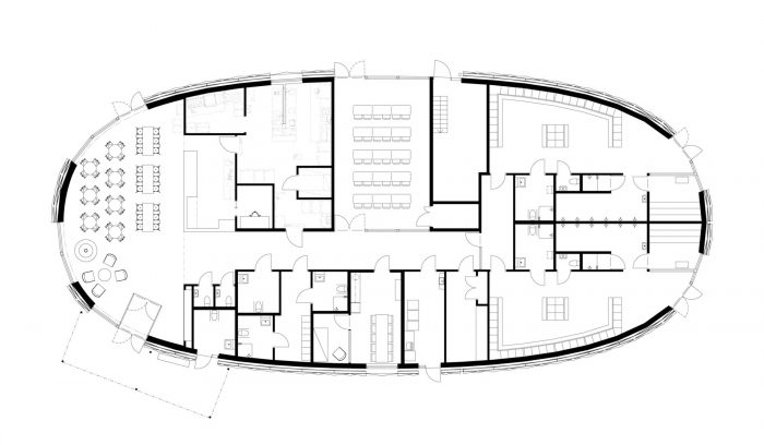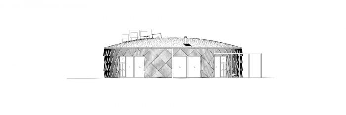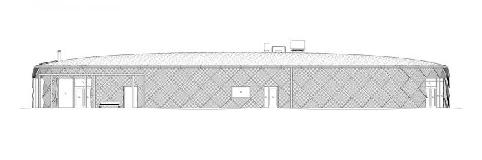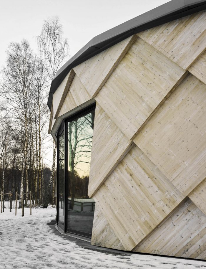 Kotten is oval in shape with an expressive facade and sedum roof, which blends in with the surroundings. The building is mainly constructed of wood, with a pine façade that will naturally become grey over time. The interior is a contrast in warm birch plywood. High demands were placed on fire safety and environmental friendliness.