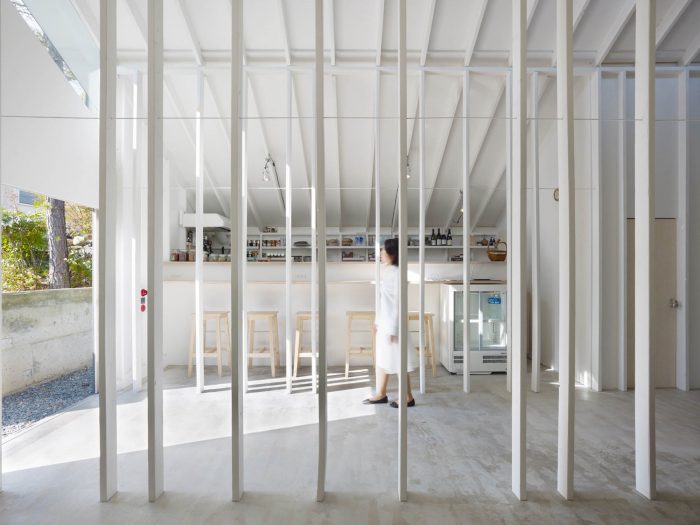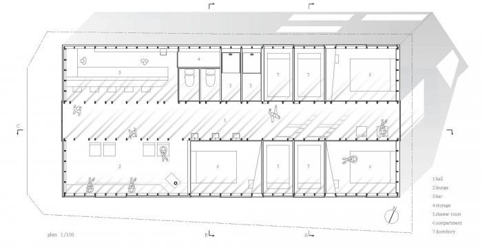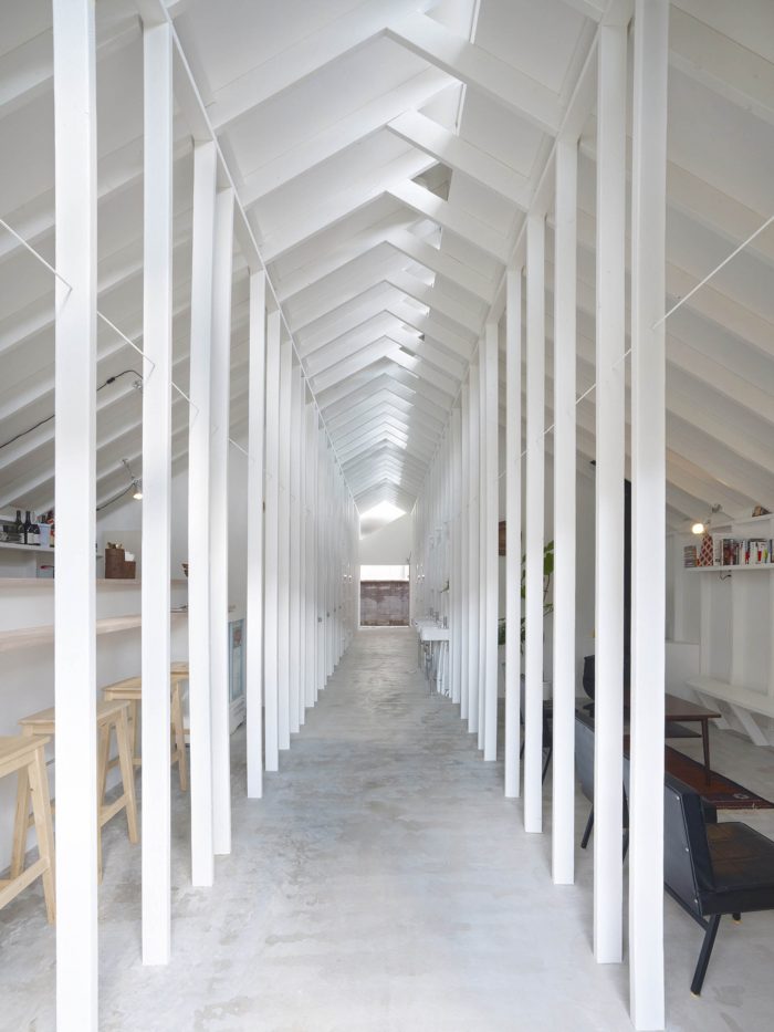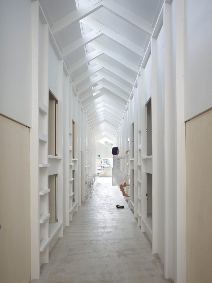 At the center of this architecture, the corridor between two wooden colonnade illuminated naturally with high-side lit connects private dormitory space and public lounge space. We make use of the subtle light from far above through the wooden structure in tribute to traditional Japanese architecture. Thin small soft pillars give the guests very human scale feeling while gathering of this pillars gives spacious feeling for lounge and bar.