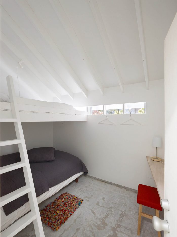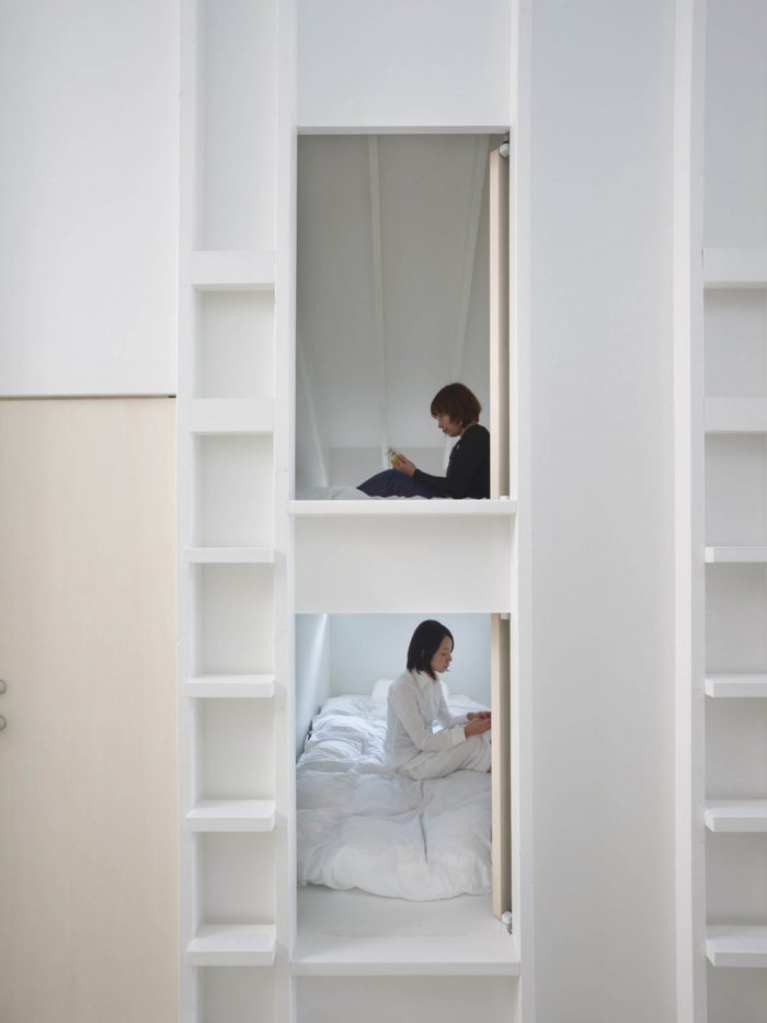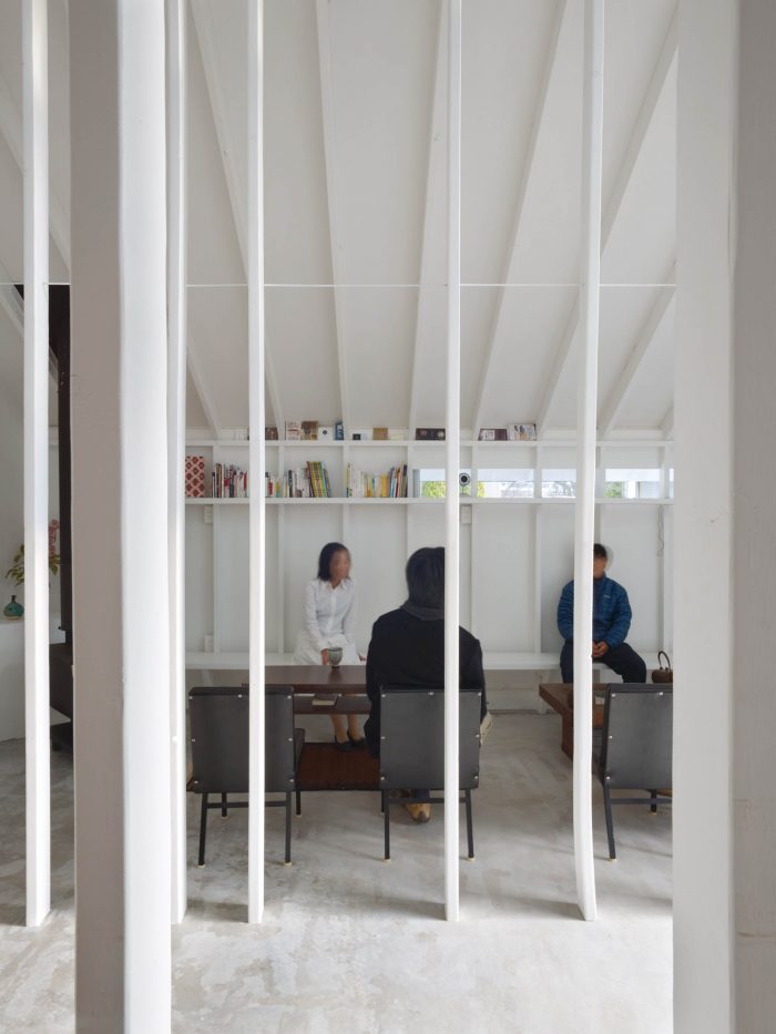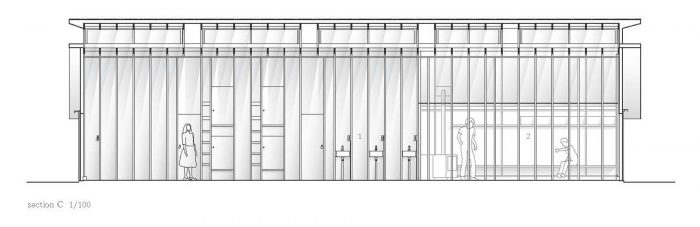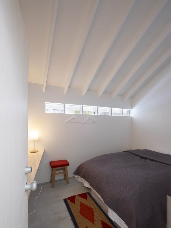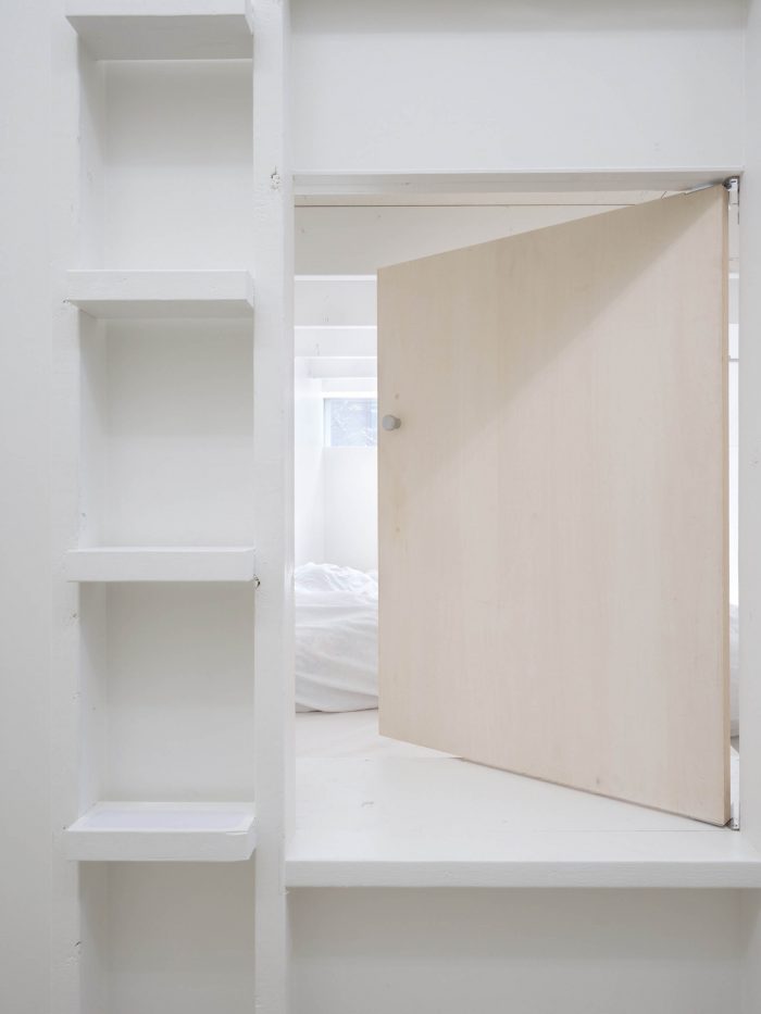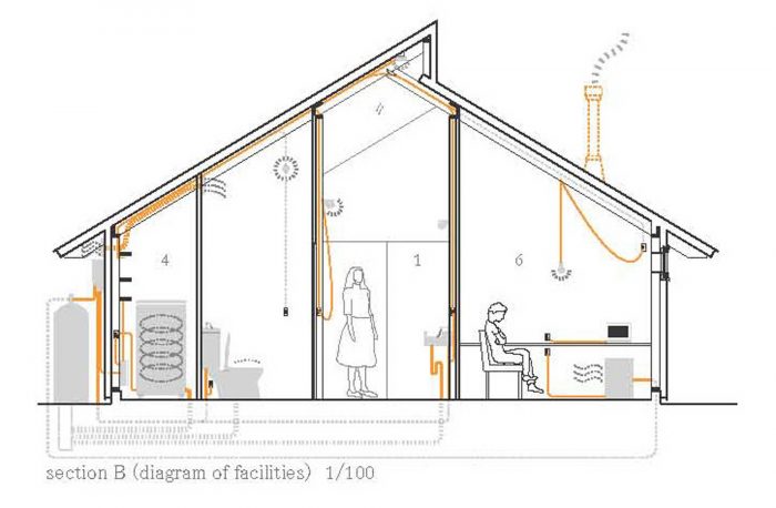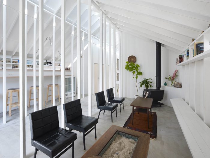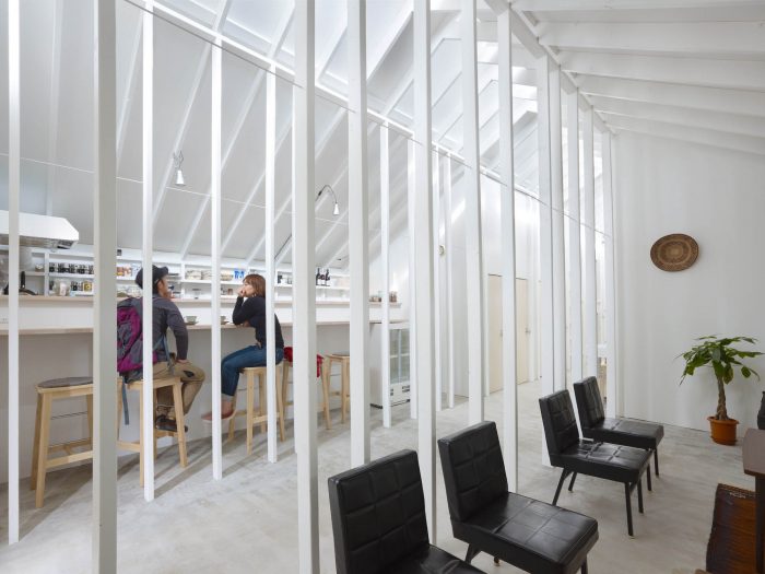 We made two different scale spaces, one is a lounge for 20 people and the other is single room of a mattress size, by setting simple wooden continuing structural frame. The architecture is consist only of 2x4 inch wooden structure set at the interval of 455mm wrapped by the exterior wall with insulation outside. We did not make the hierarchy among structure, finish or furniture, same as the old Japanese traditional architecture.