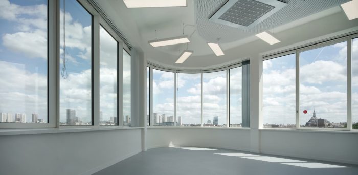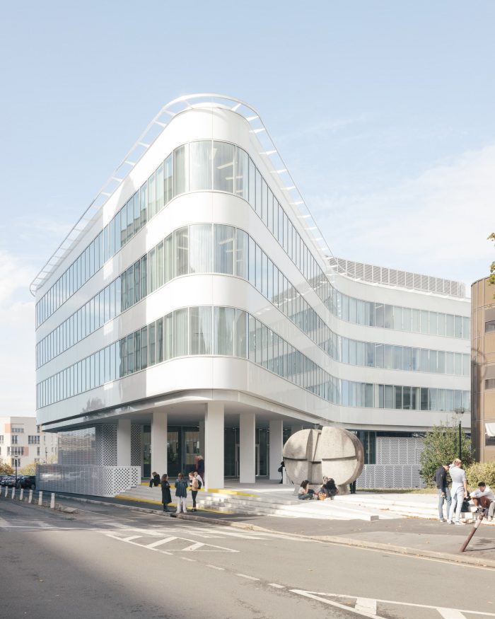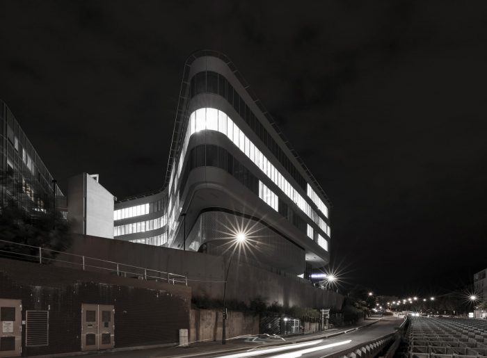 The extension of the Faculty of Medicine, at the heart of the Kremlin-Bicêtre University Hospital site, expresses its ambition to constitute a center of excellence for French research and education, open to the city and the scientific world. Located on a dominant point, it enjoys an exceptional panoramic view of Paris and its suburbs. The shape of the building takes up the geometry of the site of implantation and creates a polyhedron whose rounded corners dialogue with the existing architecture.