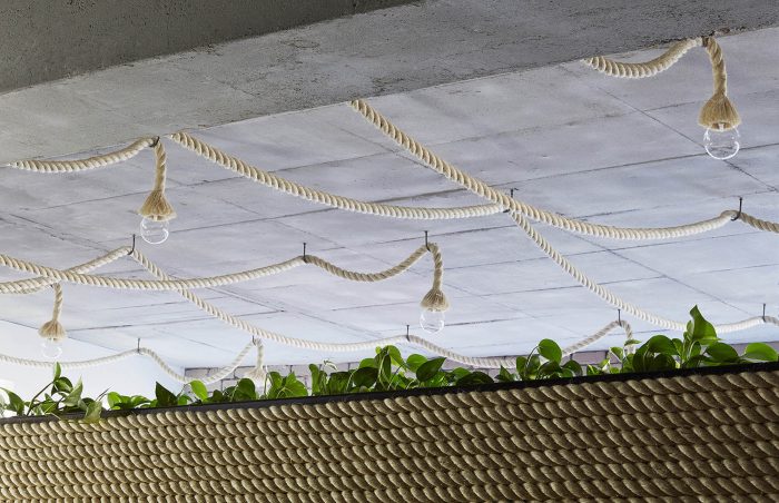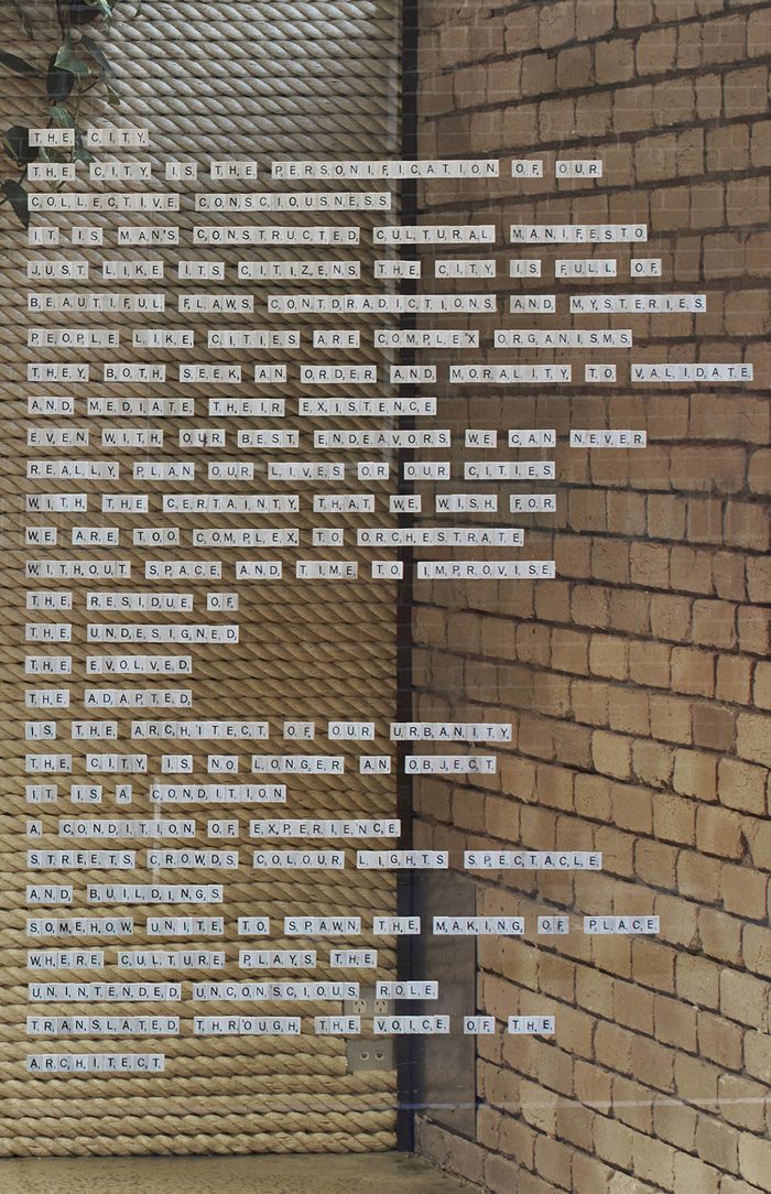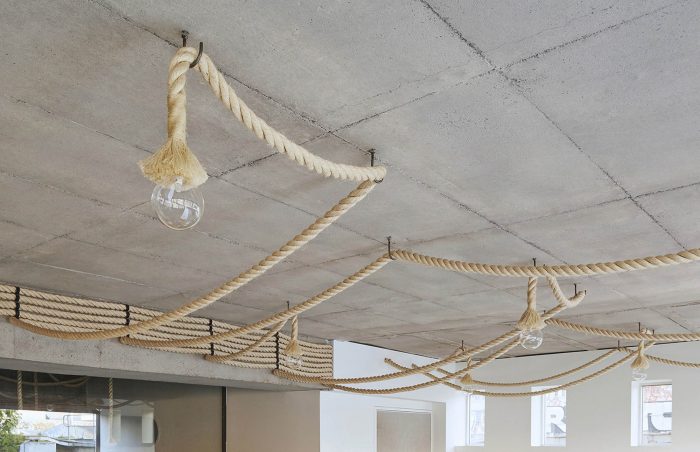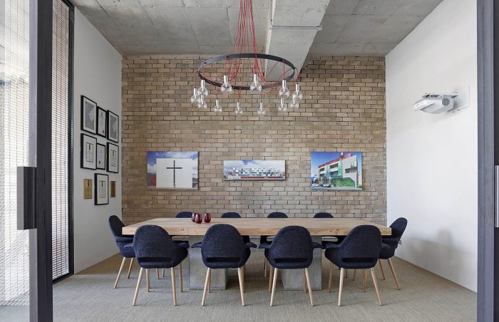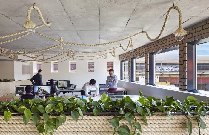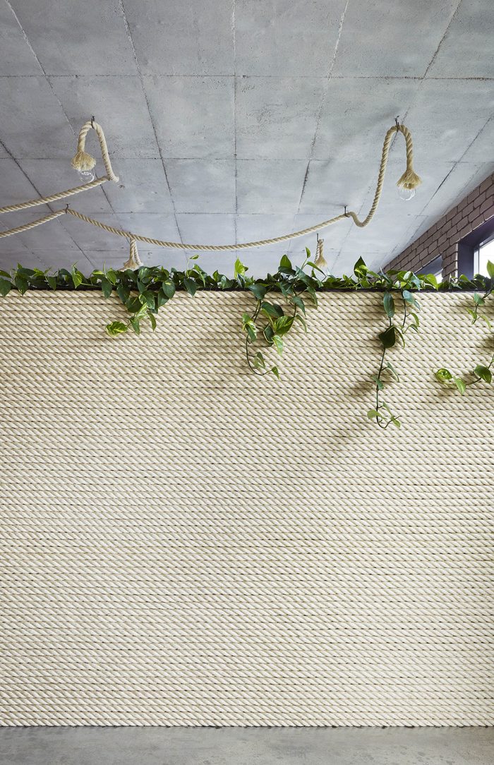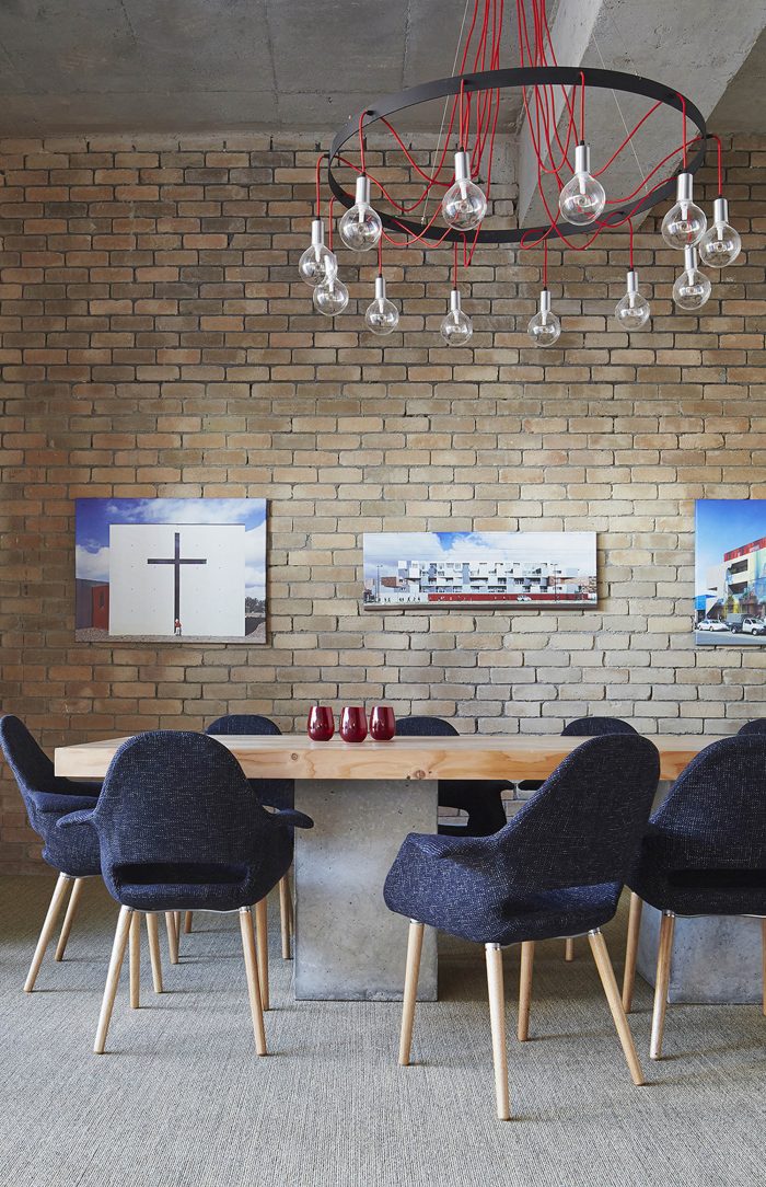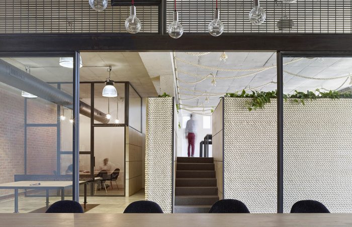 All the materials selected for the project had two important criteria for their implementation. The first was that they were environmentally sustainable and also did not require an applied finish, and the second was that they were proprietary and readily accessible to keep the cost of the project down. Almost all of the furniture, desks, board room tables, joinery, shelves and lighting were designed and custom made to maintain the continuity of the design language. The board room decks were constructed from laminated LVL timber beams with concrete pipe bases. The task lighting was custom made from Sisal rope which was also used as a wall finish. The materials provided a juxtaposition between the old and new, manufactured and organic and also is a critique to the generic commercial work environment. The project seeks to provide design alternatives for interior workspace design, sustainability and ultimately re-examine our cultural attitude for its vernacular