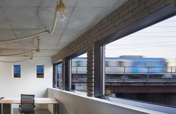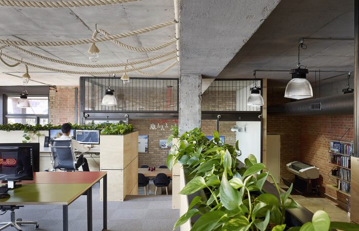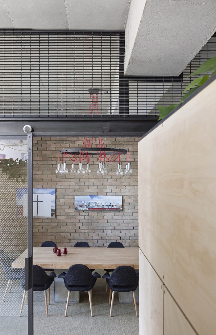 The primary focus was to incorporate environmentally sustainable non architectural materials and construction methodologies which provided juxtaposition between old and new, manufactured and organic which also played a central theme throughout the interior. The existing open plan, double heighted floor spaces and mezzanine provided us with an opportunity to create a separation between the private and public areas of the office space whilst maintaining critical visual connections throughout the entire space. The sceptical of the daily activity and the making of architecture, as well as the architecture itself is on display for all occupants and users of the space. This exchange and redefining of public and private work spaces was a critical cultural shift for the office typology. The lower level office is flexible spaces that blurred the boundaries between the public and private and created exchangeable visual events of activity for clients and employees. A defining self-watering landscaped landscape border provides a notional separation throughout the open plan and provides a soft contrast to the concrete and steel elements. The green strip also improves the air quality for occupants.