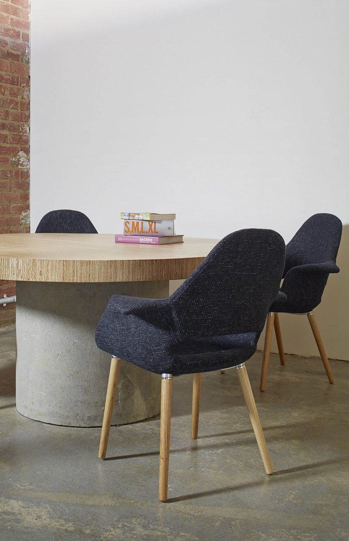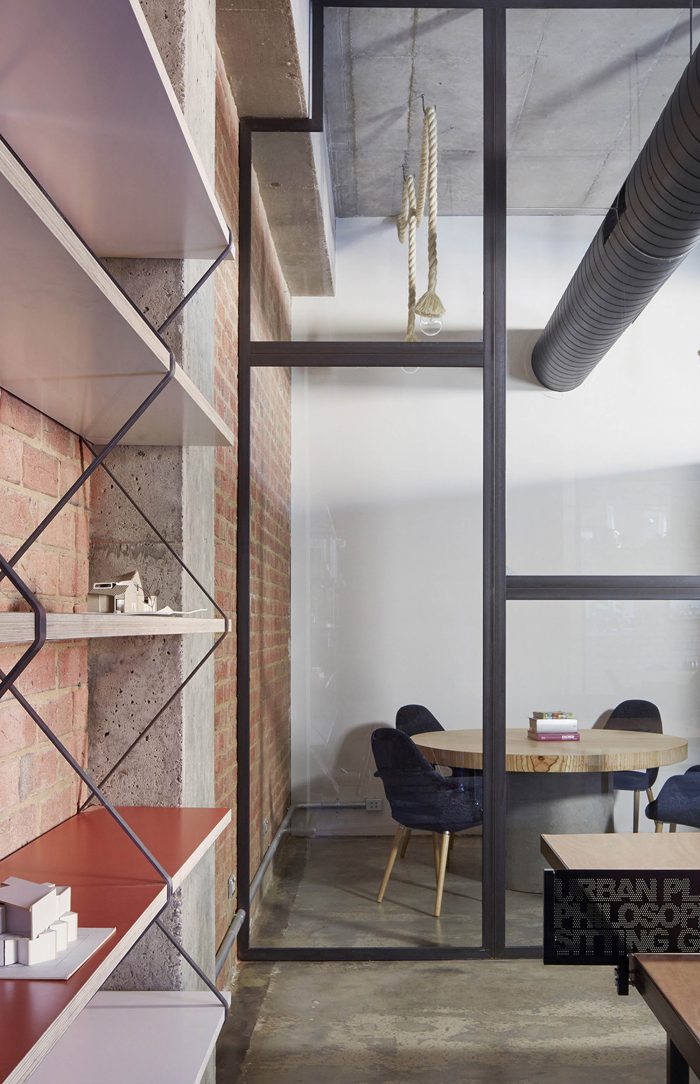 This converted inner city design studio was originally a conventional undersigned commercial office space with little regard for the environment or design. The client’s primary objective was to satisfy their current spatial requirements and simultaneously create adaptable spaces for the future. We were interested in providing a counterpoint to the existing space, but also to provide an alternative attitude and philosophy to the conventional corporate working aesthetic. Our objective was to establish and express an alternative architectural language that reflected this design philosophy and utilised the project as an experimental canvas. All existing material was stripped back to the core structure and all applied surfaces finishes were removed showcasing concrete ceilings and brick walls which provided a backdrop for our intervention.