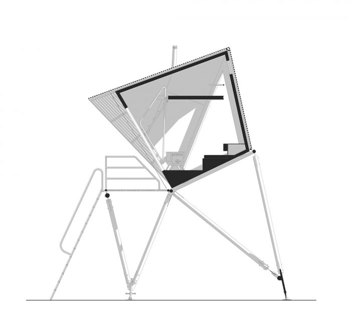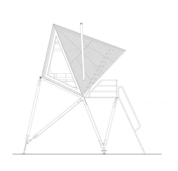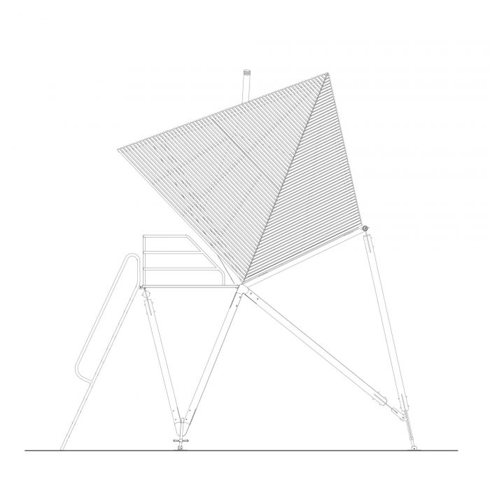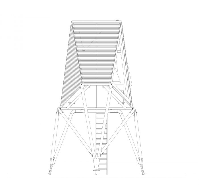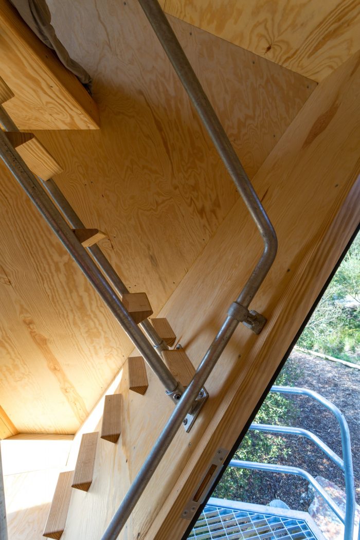 A larch-slatted skin covers the cabin that is elevated above the ground on turned pine poles. Galvanised steel is used for all railings, ladders, frame jointing and ground connections, providing both ease of assembly and extended life span of all timber elements.