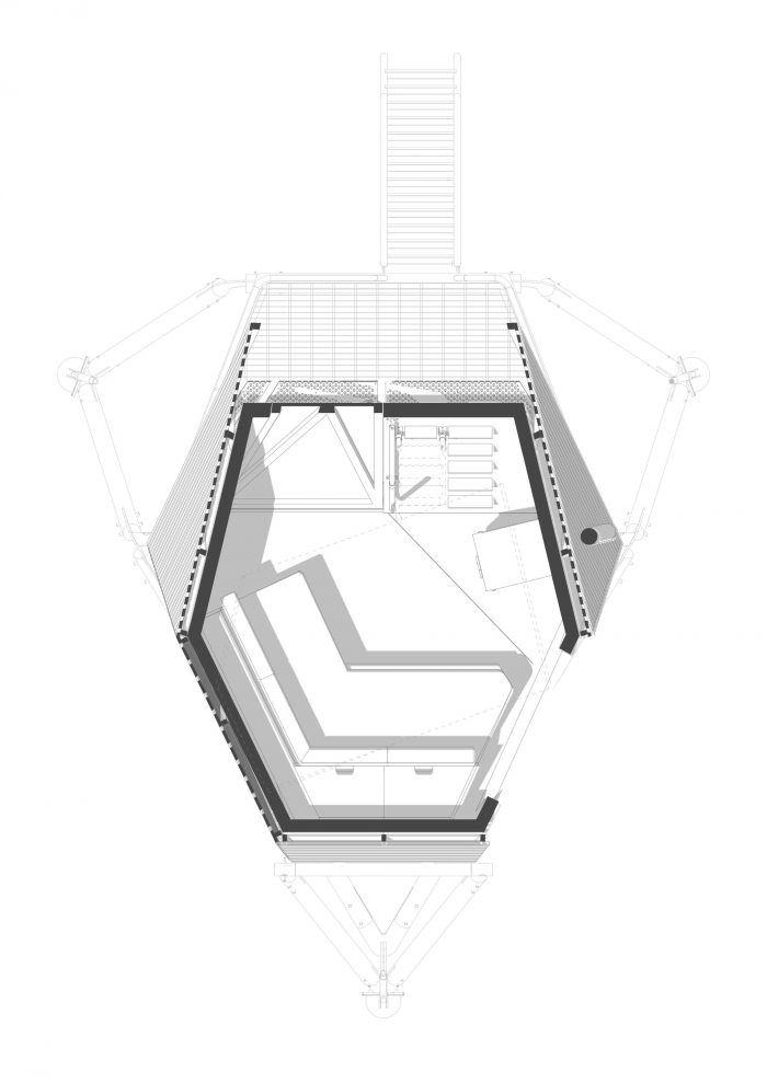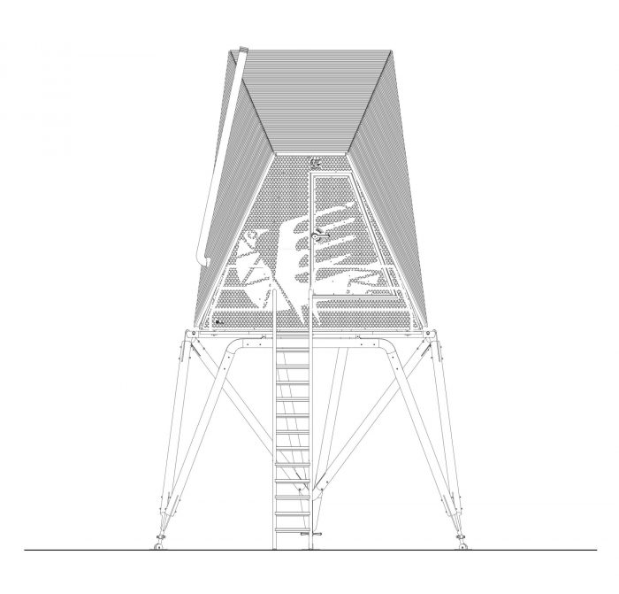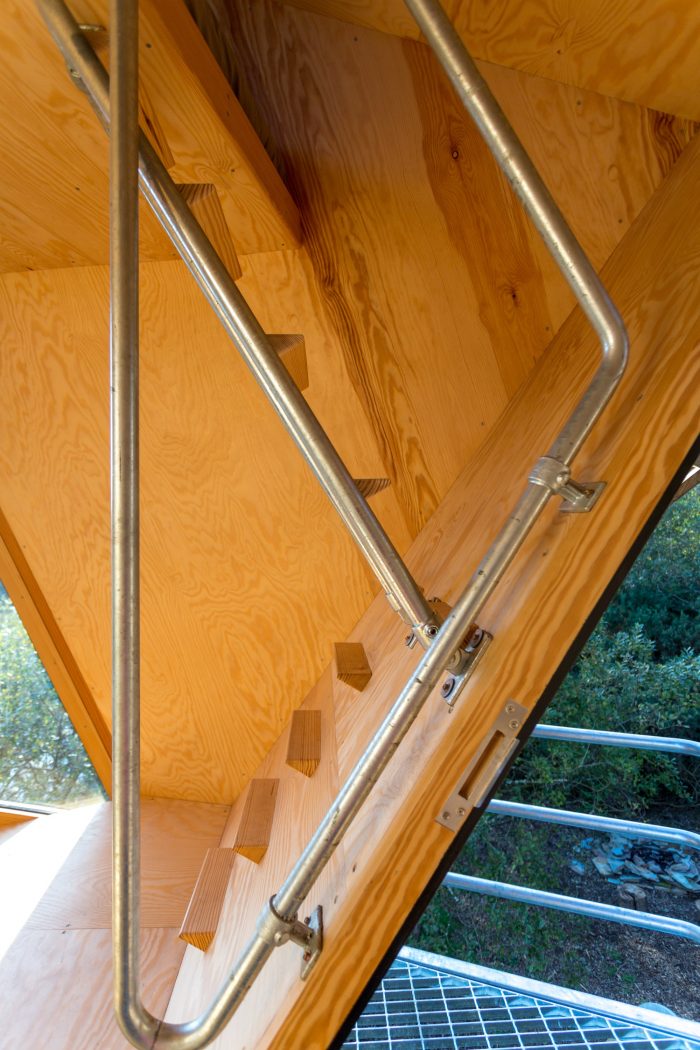 落叶松板覆盖着小屋,它被架设在松树杆上,高于地面。所有的栏杆、梯子、框架连接和地面连接都使用了镀锌钢,使所有的木材元素易于组装并延长使用寿命。