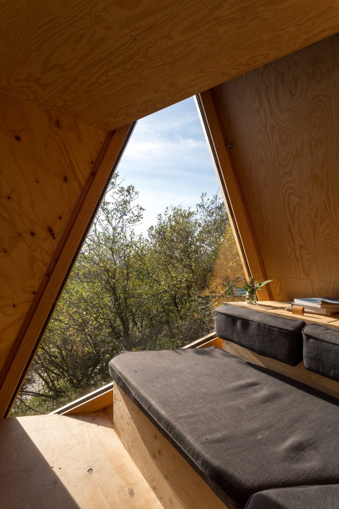 Built by boat builder turned furniture maker Toby Sharp with a small team of master craftsmen in a nearby workshop, the cabins were then assembled and transported to site before being craned onto their cradle bases. The cabins are constructed from structural, insulated paged-pine panels with an EDPM rubber membrane covering.