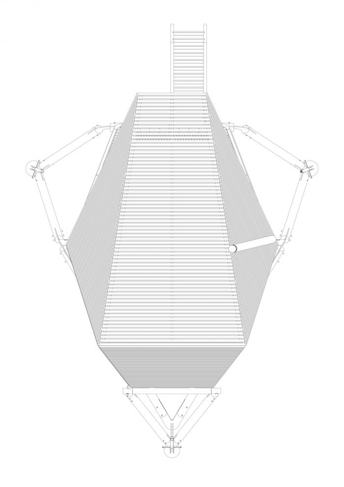 由造船师转为家具制造商的托比-夏普(Toby Sharp)与一小队工匠在附近的工场建造,然后将小木屋组装并运到现场,再由起重机吊到摇篮基座上。小木屋是由结构性的、绝缘的页岩松板和EDPM橡胶膜覆盖构成的。