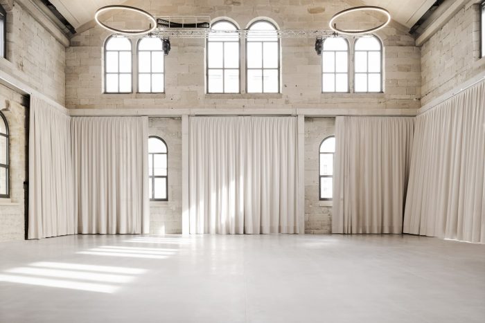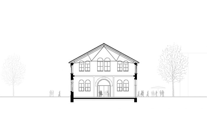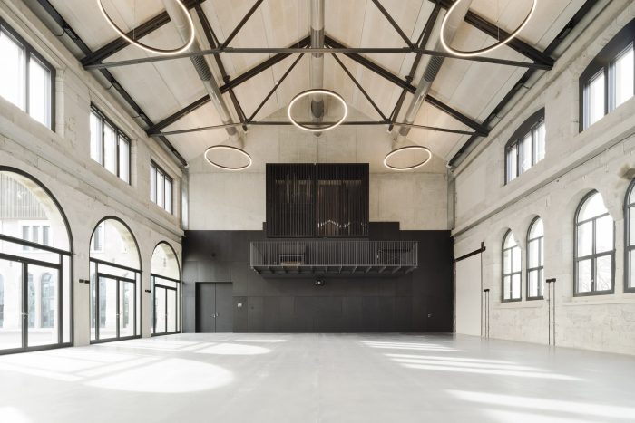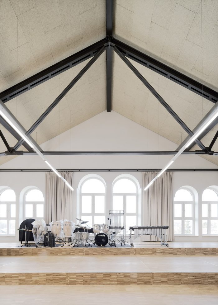 The historical façade provides the shell of a generous space. New boxes were placed inside this completely gutted space, zoning the interior for different uses. These boxes also support and brace the new load-bearing structure. The large halls and the public uses are housed in the old building. The rooms of the music school and the theatre workshops are housed in the new volume, the cuboid. These rooms “serving” cultural production and education symbolically arch over the show stages for the culturally interested public. It was important to us to create an authentic and independent ambiance for the different cultural venues with historical components such as materials, windows, and visible roof construction.