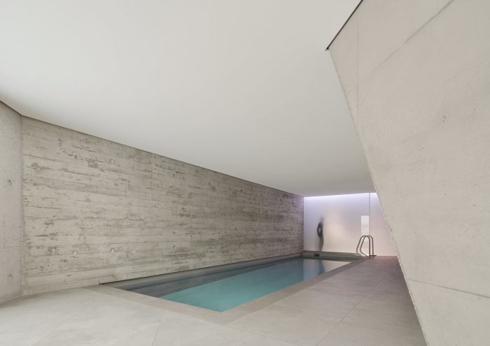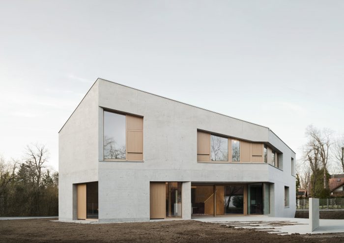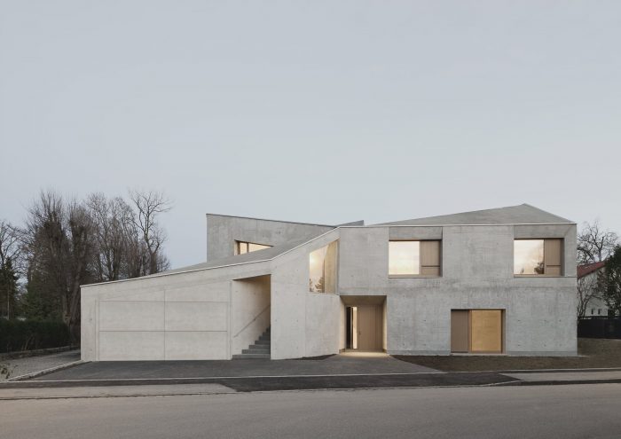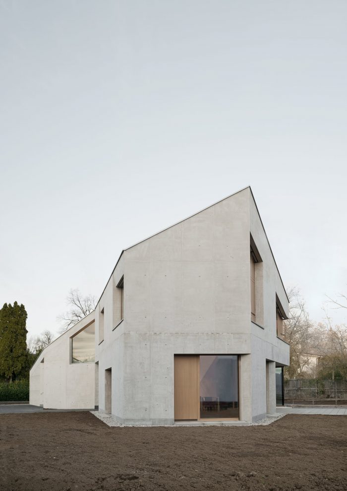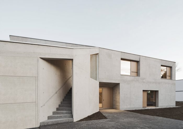 House L, a single-family house containing an office wing and an apartment for an au pair, is sculpted as a monolith of massive concrete. It is as it appears to be: inside and outside concrete, without further insulation or cladding.