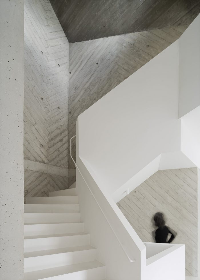 形式的统一性反映在材料的统一性上。红外线混凝土的厚厚的自保温墙面是光滑的,表面有纹路,而屋顶的底面用粗木板的百叶窗来装饰,强调了各种表面的方向。对角线百叶窗贯穿到入口区地面的乳白色多边形瓷砖上。这些柔软的表面辅以中性色调的乳白色石膏、灰色石材和地毯,以及自然色调的橡木和烟熏橡木的家具。