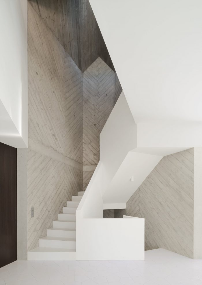The light well of the V-shaped staircase tunnels down to the basement, where a swimming pool, steam bath, sauna, and fitness room open onto a sunken garden on the east side.