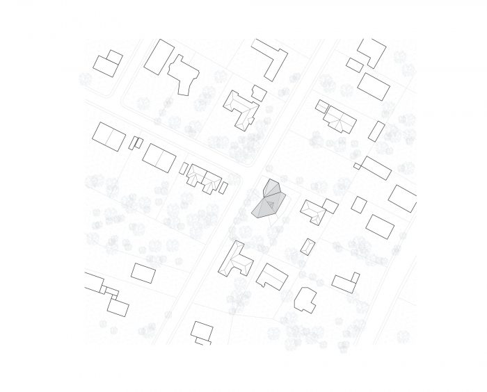 The crystalline form takes its cues from the surrounding buildings: compact single houses from the 1930s with hipped roofs standing at the corner of large gardens. Here, the six-sided object is angled to leave space on the northwest for the garage and to allow for a spacious garden to the south.
