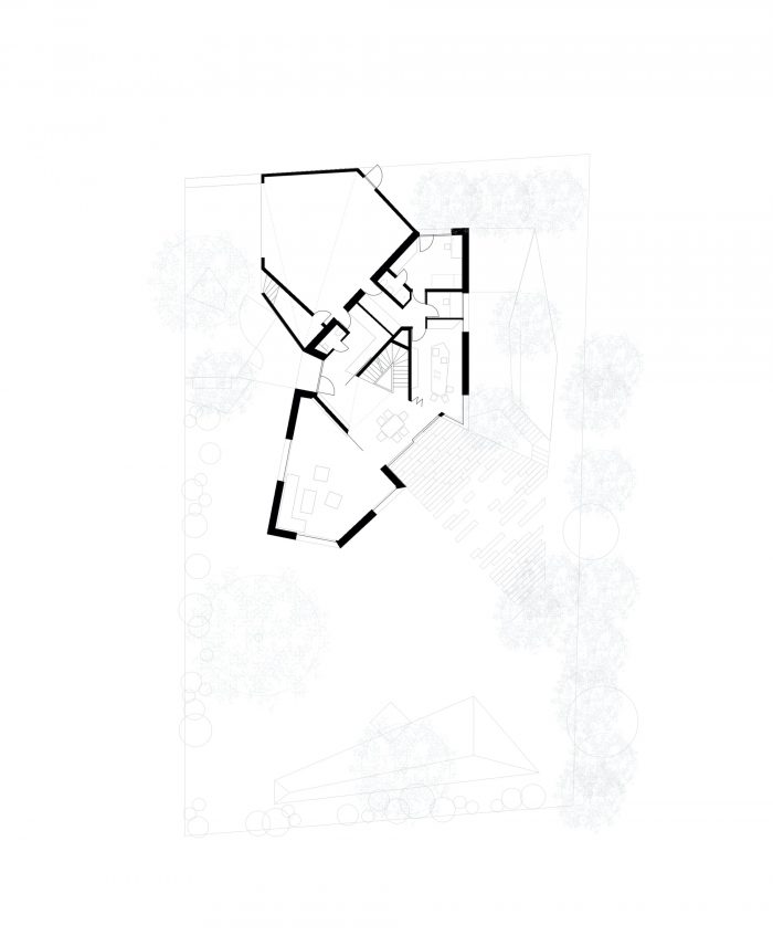 The plan is developed around a lozenge-shaped stairwell, which is the loadbearing core and integrates the central servicing shaft. The rooms are arranged around this central element, each opening out onto different outside spaces.