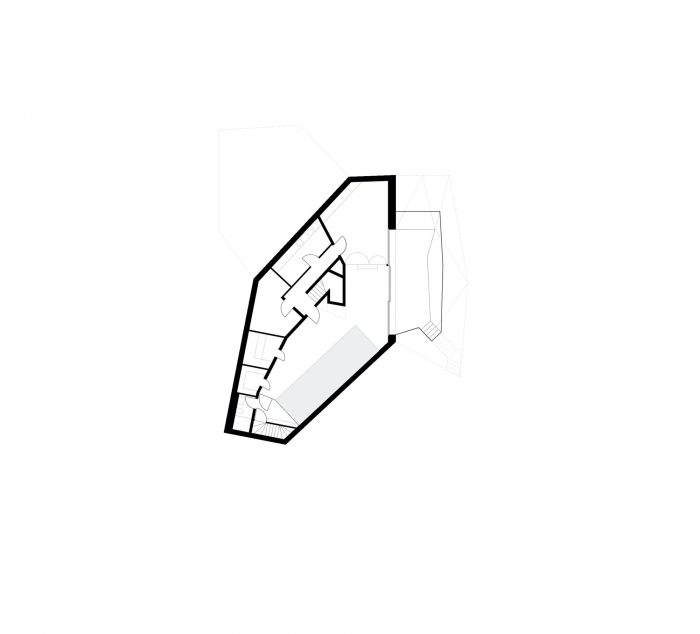 该计划是围绕一个菱形的楼梯间展开的,它是承重的核心,并整合了中央服务井。各个房间都围绕着这个中心要素排列,每个房间都向不同的外部空间开放。