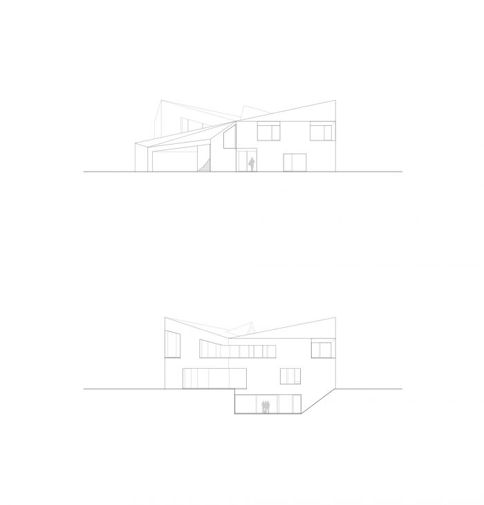 底层平面有一个多边形但紧凑的形式,塑造了内部房间、花园区域和折叠式屋顶。
