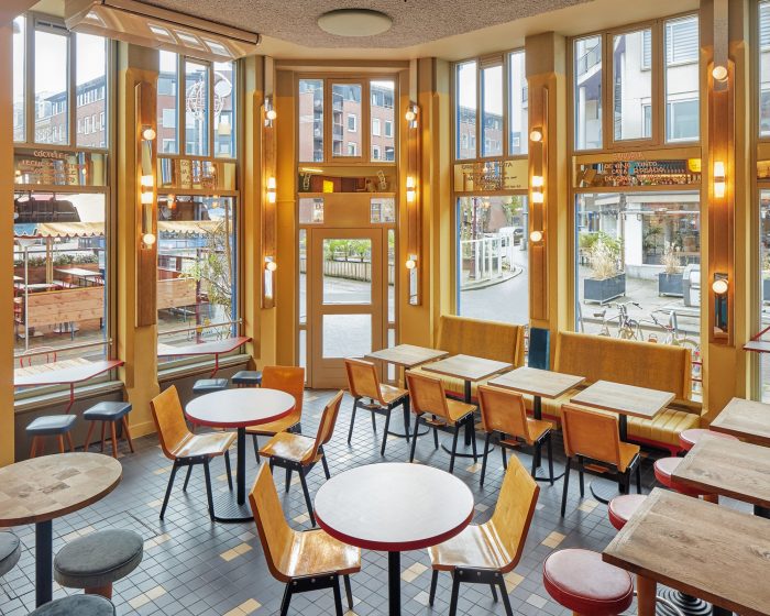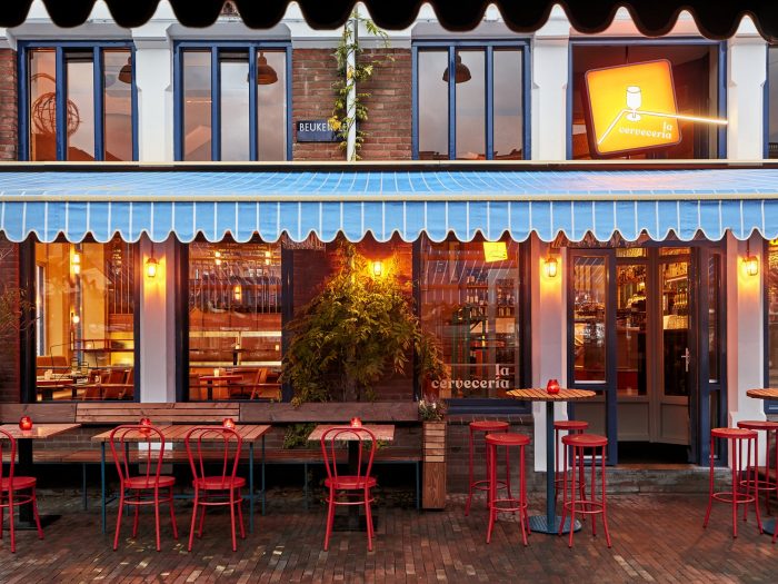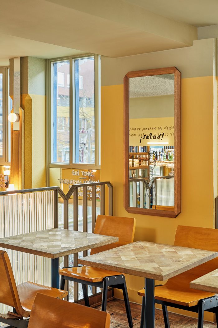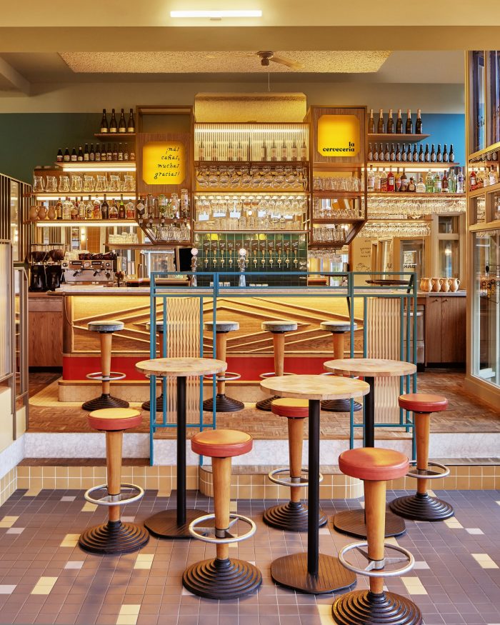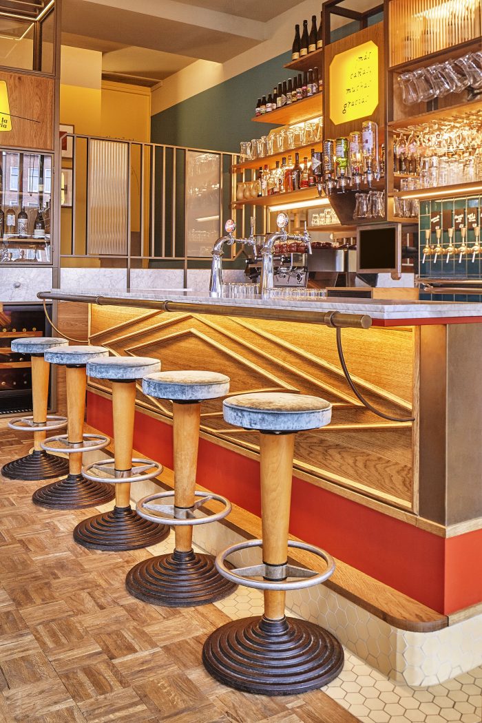 In the green neighborhood of Amsterdam east, the warm ‘pincho bar’ La Cervecería, has opened its doors to the public to bring the warm side of Spain to the Dutch capital. This Spanish-inspired bar has been designed by Studio Modijefsky, which, using a traditionally southern color palette and a lively juxtaposition of modern patterns, created a cozy space for locals to feel on holiday and for southern internationals to feel home. The interior references to typical “cervecerías”: places where Spaniards go to spend their after-work time in the company of colleagues and friends, to enjoy “cañas” and “pinchos” in an informal environment. As you enter the space, the interior immediately appears friendly, welcoming and vibrant. A dynamicity is created by the definition of different settings: whether you want to spend the night sitting at the bar, gather at a high table, or intimately dine, La Cervecería appears as the ideal place for it. The interior recalls the traditional Mediterranean canteen, thanks to a distinct colorful palette, with the addition of a modern touch which is able to link southern tradition to the contemporary Amsterdam hospitality scene. The masterly use of warm colored oak wood, inclined mirrors, wooden profiles with an old-fashioned feel, bronze railing and modern floor patterns, results in an extravagant composition of elements, which is ultimately in perfect balance.