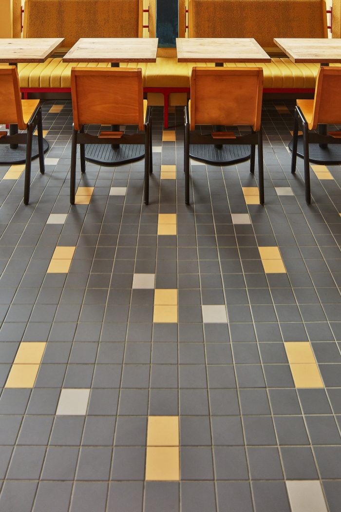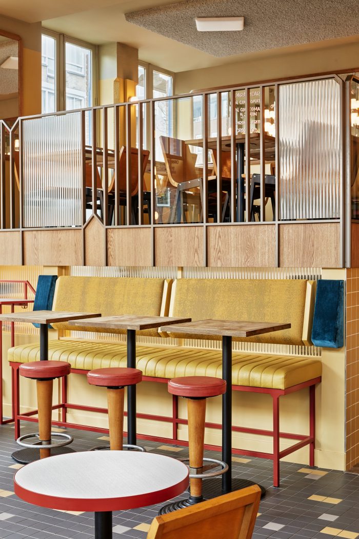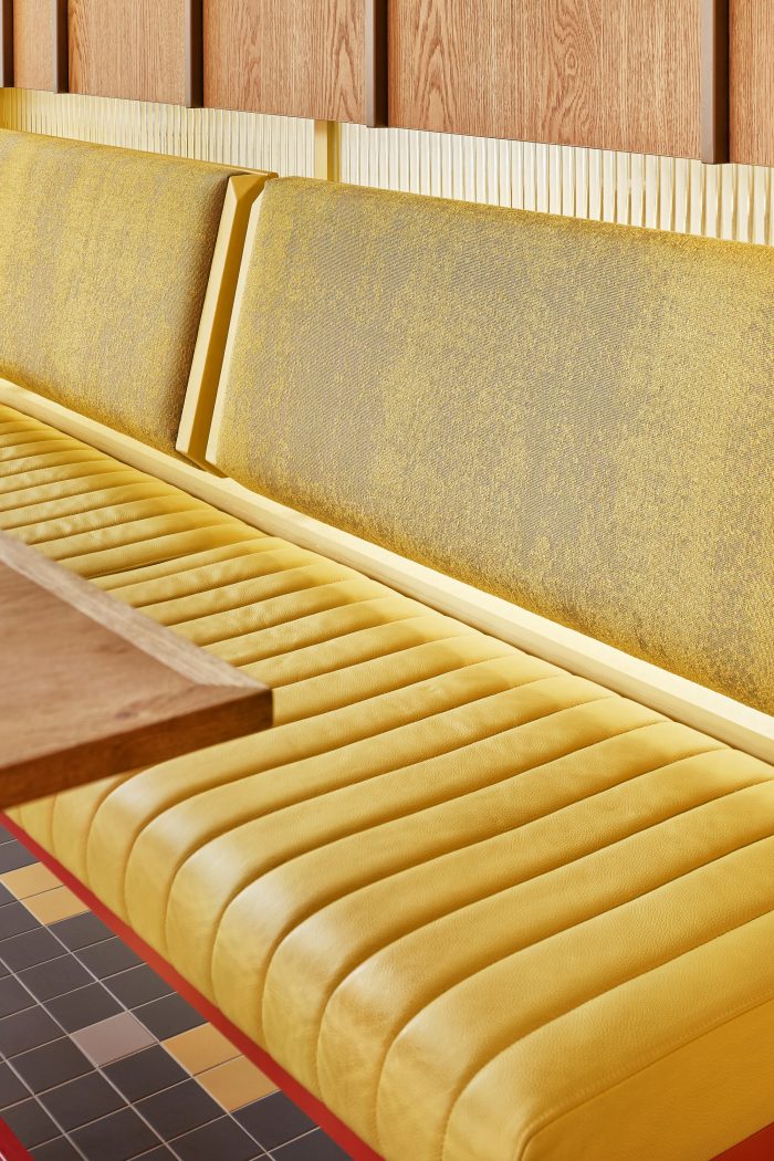 La Cervecería’s interior is divided in three main areas; as you enter the space, you face the dining area, which is a mix of low and high sitting, round and square tables, placed on a graphic tiled floor. On two sides, a high and a low bench, define the space with their warm looking yellow textiles and leathers. The design of each piece is a reference to the columns of the building, whose corners are smoothed by a 45degrees trim. Yellow-shaded wooden chairs complement the colors of the dining area. Next to them, custom made tabletops animate the environment with a textile-like finish and wooden checkered patterns. The verticality of the space is emphasized by upholstered panels featuring vintage light fixtures, which décor the columns until the ceiling, enhancing the double height. Looking to the right, you will find the majestic front bar, standing on a pedestal. The use of aged brass, softly-toned yellow tiles and Carrara marble, all enriching the wooden base, recalls elegant bar counters of old southern cafes, and it is finally freshened up by a red powder coated steel plate that embraces it, adding a special layer. The back bar stands there almost as an apse, a triptych made from wood and brown steel, whose three-dimensionality is dramatically emphasized by the lightboxes, the mirrors and the glazed dark green tiles. This is where all the beers are displayed and served. The last area is the mezzanine, overlooking the ground floor and the kitchen. On the background walls, oak frames disrupt the visual paths by using mirrors in the principle of folding doors, reflecting the space in different directions and unifying it at the same time. Here, a funky corner bench, with its red leather and yellow-blue textile, dominates the surrounding wooden environment with its character. The tables are defined by the same checkered pattern found at the entrance, visually connecting the two spaces. The three abovementioned areas are cleverly connected by mainly three elements: the railing, the flooring, and the graphic layer.