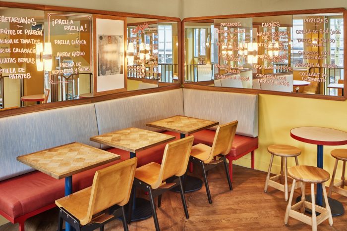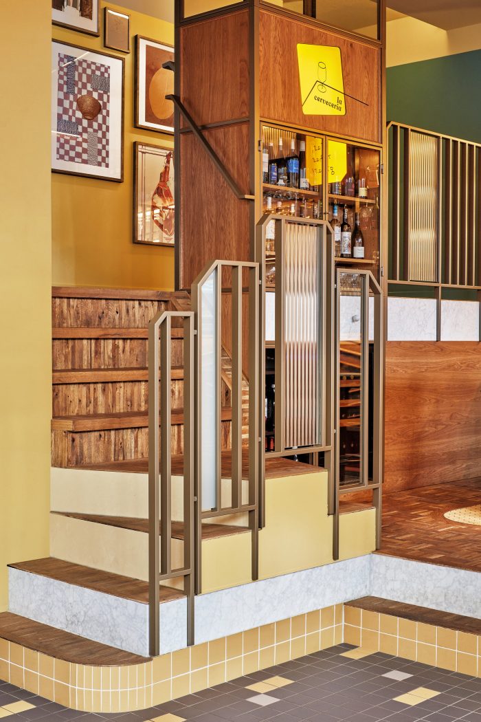 The floor changes at each level of the space; the first encounter is a black tiled surface, on the ground floor, which contains couples of yellow tiles, and sparks of grey appear in an apparently random order. This pattern naturally directs the eye through the space, bringing your attention to the steps, whose materials change as you go up, from yellow tiles to Carrara marble, ending up on the wooden chessboard floor contoured by an oak edge. The bar area is defined by the small and elegant yellow hexagonal tiles, which fold into a step on top of which the front bar stands. A carefully placed staircase connects the three spaces, a podium opened to three directions and which directs visitors upstairs, to the mezzanine. Wood here is the absolute protagonist. A big vitrine stands at the sides of the steps, showcasing dozens of wines and Spanish products. Once up, a diagonal restored wooden floor meets patches of the chessboard floor mentioned before. The railing elements stand in the middle of the volume.