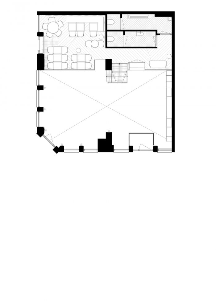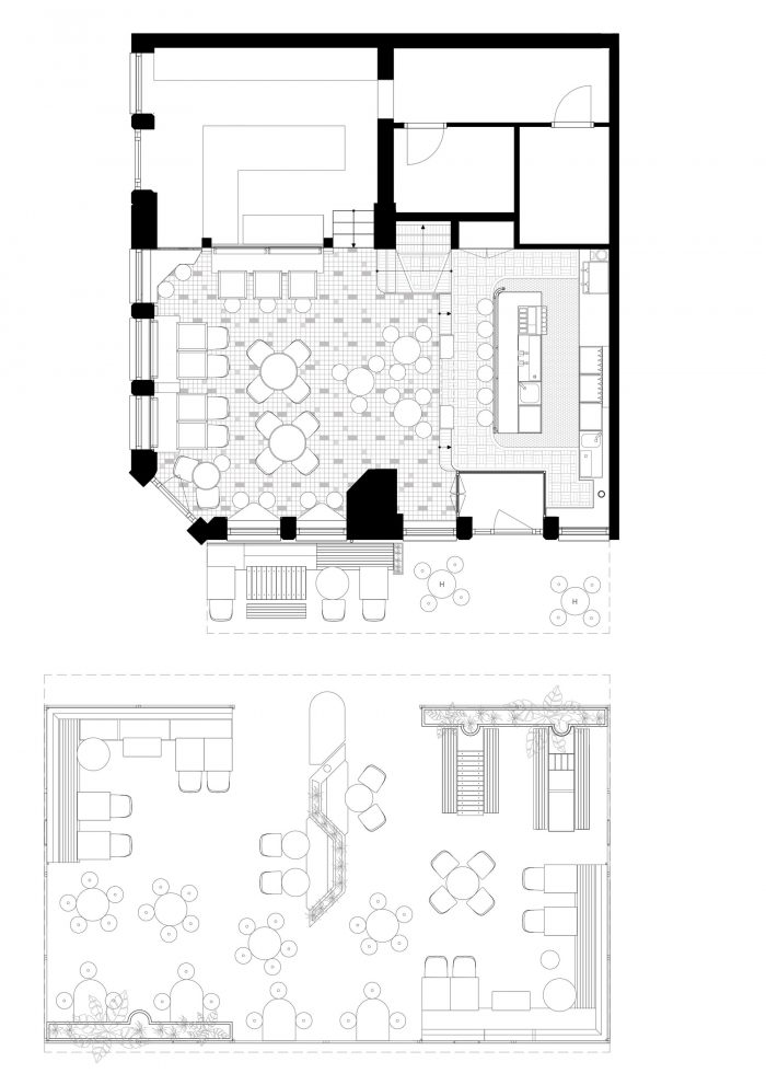地板在空间的每一层都有变化;第一次遇到的是黑色的瓷砖表面,在一楼,它包含了几块黄色的瓷砖,灰色的火花以一种明显的随机顺序出现。这种模式自然地引导眼睛穿过空间,把你的注意力带到台阶上,台阶的材料随着你的上升而变化,从黄色瓷砖到卡拉拉大理石,最后是由橡木边缘勾勒出的木制棋盘地板。吧台区由小而优雅的黄色六边形瓷砖界定,这些瓷砖折叠成一个台阶,前面的吧台就站在上面。一个精心布置的楼梯将这三个空间连接起来,一个向三个方向开放的平台,它将游客引向楼上的夹层。木材在这里是绝对的主角。一个大的玻璃柜矗立在台阶的两侧,展示了几十种葡萄酒和西班牙产品。上楼后,一个对角线修复的木质地板与之前提到的棋盘式地板的碎片相遇。栏杆元素矗立在体积的中间。