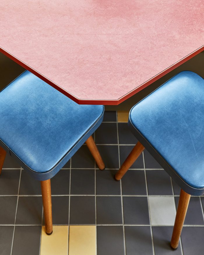 They have a classic connotation defined by the modern Modijefsky touch, with vertically striped glass insertion in bronze powder coated steel frames. These are detailed by forty-five degrees corners and triangular shapes that break the rhythm of the vertical lines. They create a game of transparencies and opacities which impacts the spaces without disrupting the fluidity in between them. Last but not least, a subtle but strong graphic layer sits on top of this entire scenery, bringing a fresh and funny touch to the table. Fine illustrations of a hairy chubby guy and parts of his body, lay around the space, stealing a laugh at a first glance. Funny details, phrases, Iberic menu items and small descriptions, bring you to the world of ‘cervecerías’, and give the guests all the instruments to be teleported to the other side of Europe.