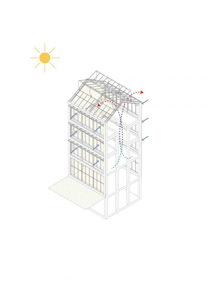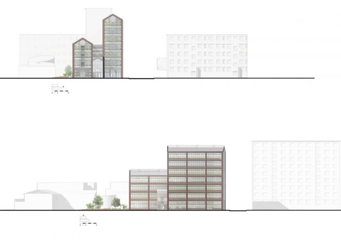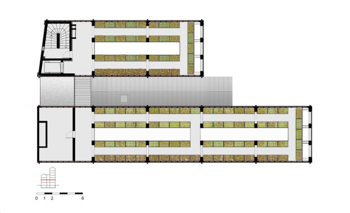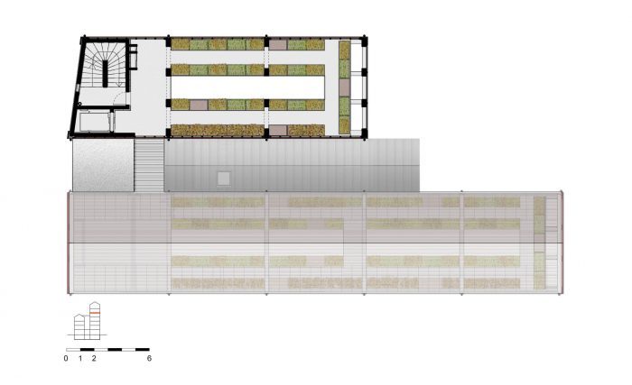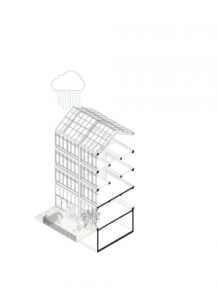 一个向城市开放的创新项目,与该地区内的城市动态相称。其外墙的同质化构成,一个合适的、适应性强的建筑,表达了它的农业天职:日光、太阳和热保护、雨水收集等。作为一个 "受控 "的生物气候环境,它将通风系统和日光结合在高性能的热封套内。