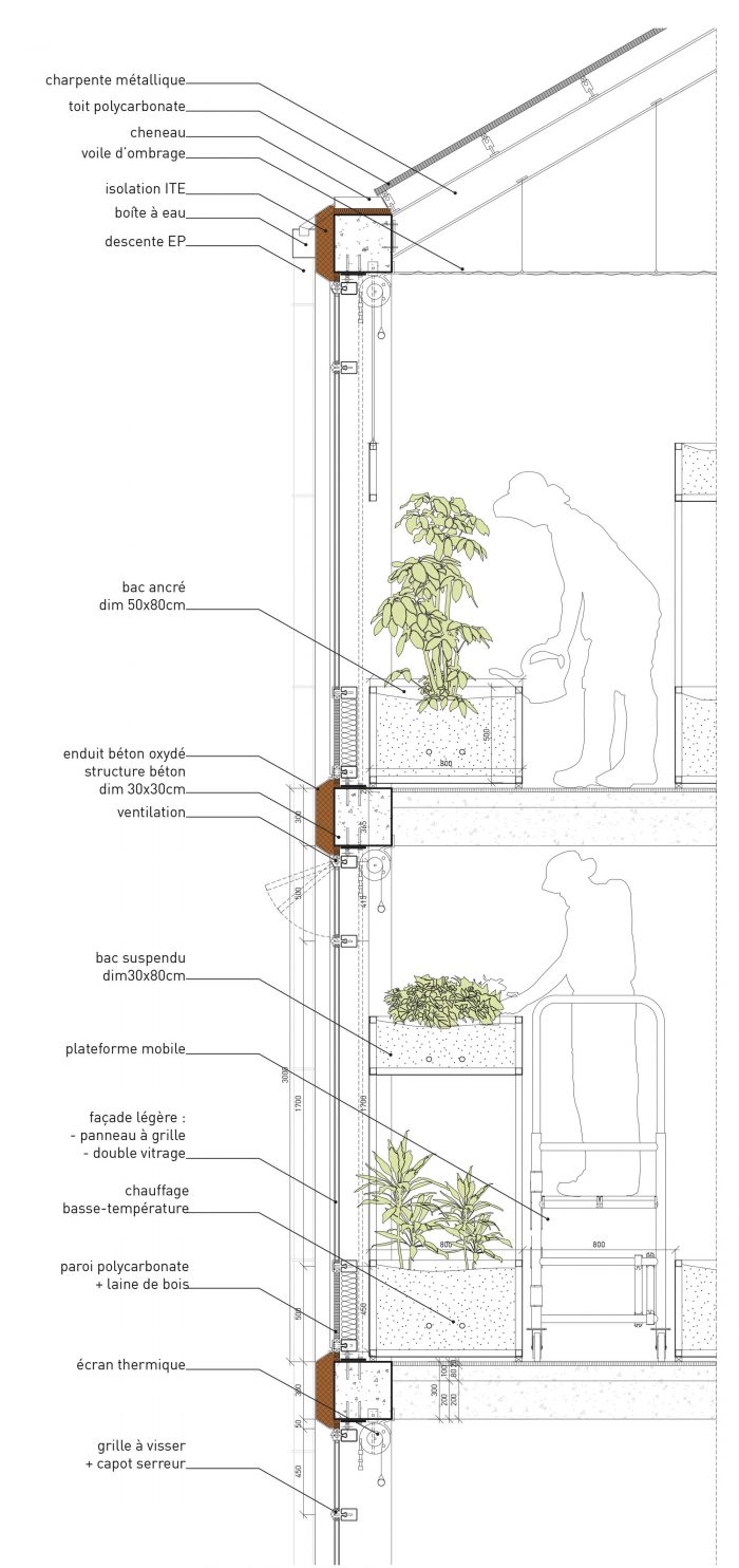 为了响应设计大纲的功能要求,设计意图包括为可核算农业服务的效率目标。整合在场地内的Cité Maraîchère是一个教育建筑,有利于参与社区生活的交流,并传递循环经济的价值观和原则。