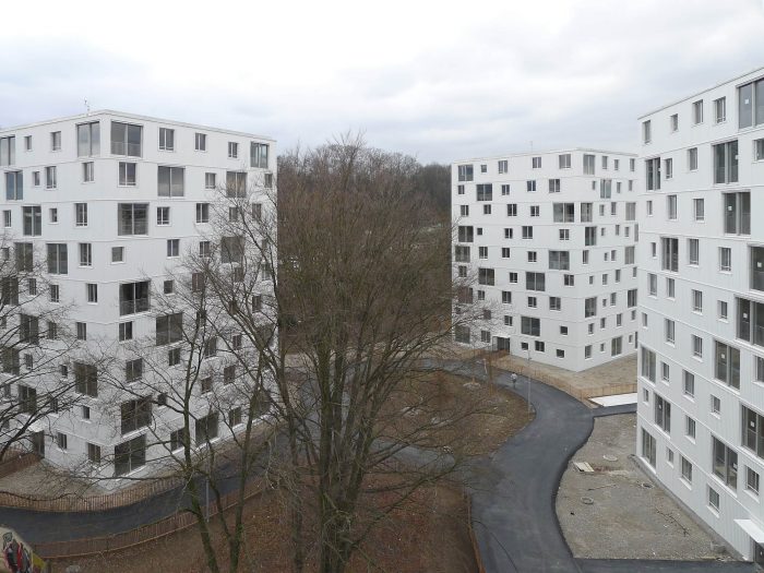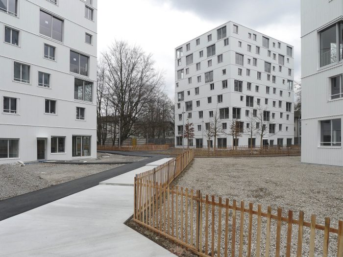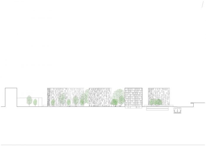 The project reinterprets the former construction’s planning principles, which can be described as living in a park. Seven new compact buildings are freely disposed in-between the existing trees, which are preserved. They define quality outdoor spaces, providing residents great visual relationships with both buildings and landscape.