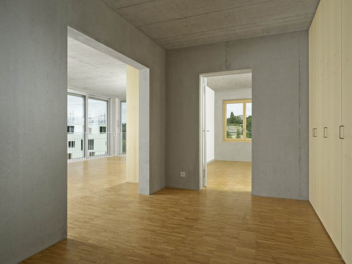 The project forms a homogeneous whole. Each building acquires singularity by varying the positions and dimensions of the windows. Developed from three concentric structural rings, each floor receives different typologies of apartments, from one to five rooms. The latter are distributed by generous entrance halls characterizing the proposed typologies. On this principle, eight different floor plans are stacked and then redistributed at different levels in each building.