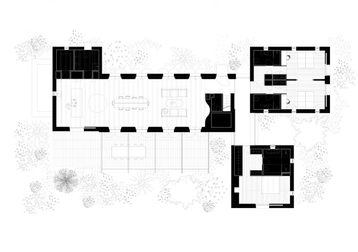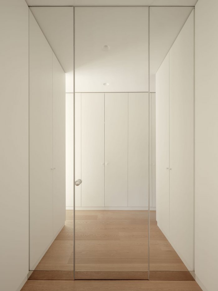 在内部,房子可以作为一个大的开放空间来体验,但它也可以分为两个明显不同的部分(一个更公共,另一个更私人),物理上的分离可以通过简单地滑动一个大门板来实现。