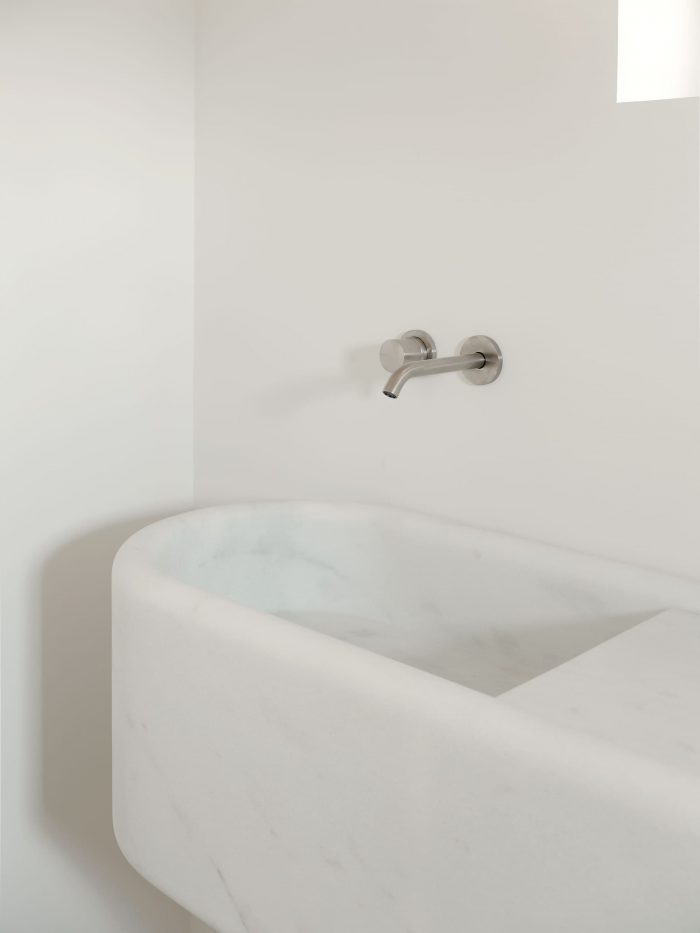 The volume of the children's bedrooms has been designed so that it can evolve over time as they acquire more independence. The master bedroom, on the other hand, has a walk-in closet and gives access to the bathroom through a fully mirrored front defining a small boudoir. The bathroom has a double shower in marble stone, and a single-block custom-made sink carved in the same stone. The bedroom also has a fireplace elevated on a concrete bench and panoramic views over the garrigue. On the upper floor there is a quieter familiar living room, also equipped with a fireplace, and at the west end, across the bookcase, the guest bedroom, with its own bathroom and walk-through dressing room.