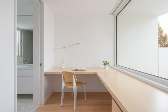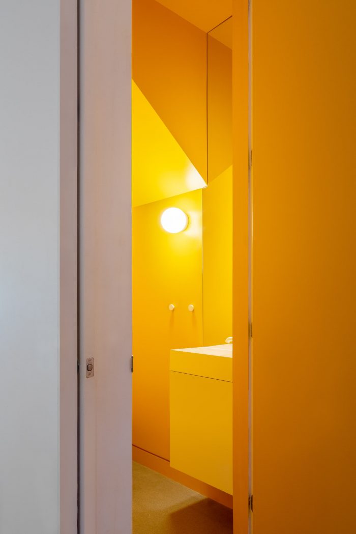 On the garden side, the bright yellow painted facade visible from the green alley is the image of the family: dynamic and colorful. Moreover, the interior of the house is punctuated with touches of this same tonality. Also, the overhang of the second level dramatizes the architectural and formal expression of the back facade. The latter allows, on the one hand, to protect the terrace and on the other to create depth through a play of offsets between the adjoining facades not negligible for the privacy of its residents.