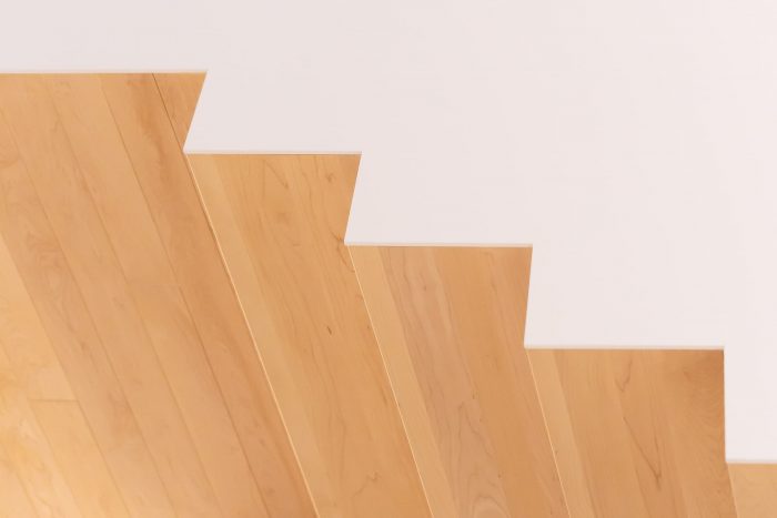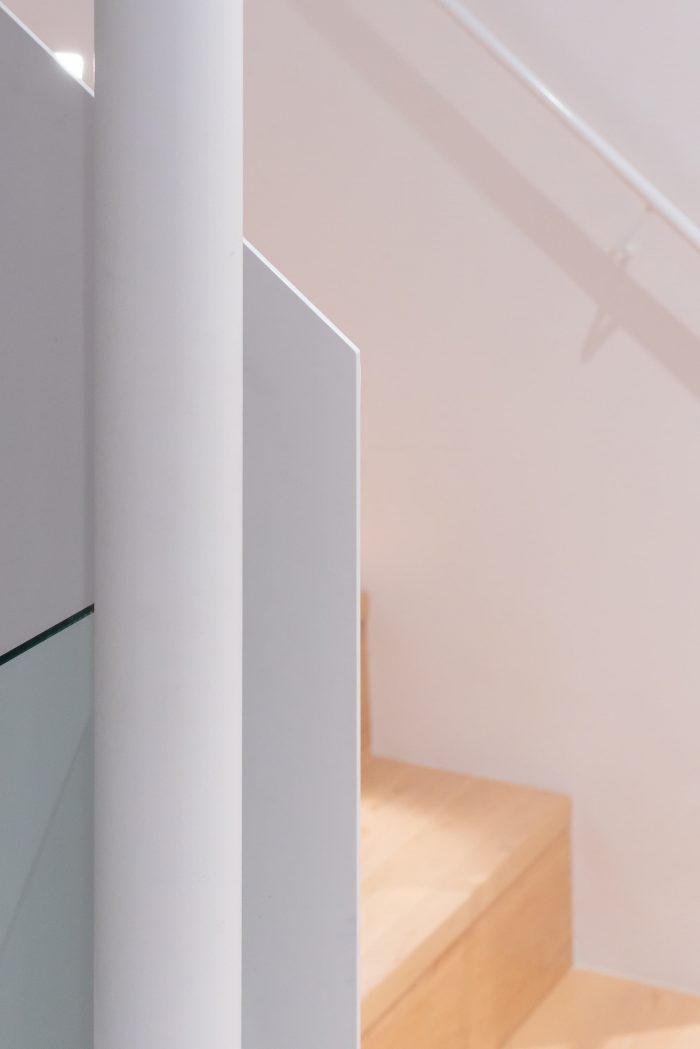 A central staircase with white-painted steel stringers and maple steps connects all 3 floors together. Coupled with the double height and its glazed openings in the house's different rooms, it becomes a truly playful and dynamic space for the family.
