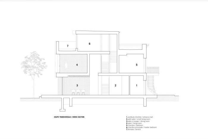In this way, the brick added to the double-height space allows to make the link between the two main rooms of the house, the dining room and the den up above, while marking the importance of the latter; places where the family gathers.