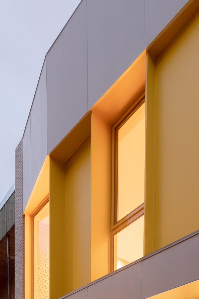 在花园一侧,从绿色的小巷中可以看到明亮的黄色油漆外墙,这就是这个家庭的形象:充满活力和色彩斑斓。此外,房子的内部也点缀着这种相同色调的装饰。此外,第二层的悬挑使后门面的建筑和形式表现更加突出。后者一方面可以保护露台,另一方面可以通过相邻的外墙之间的偏移游戏来创造深度,这对于居民的隐私来说是不可忽视的。