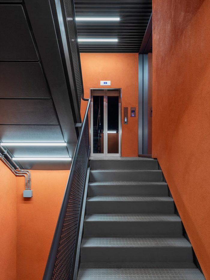 The newly built panoramic elevator, which replicates the form of the stairwell as designed in the 1957 version of the project, is treated as a technical insert inside the structural partition of the façade along the courtyard: it flanks the existing egress stairs, improving internal flows while providing direct access to the restaurant on the sixth floor, directly from the courtyard, also outside opening hours. All the shop windows alongside Piazza Fiume and via Salaria have been replaced, restoring original geometries and proportions.