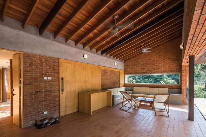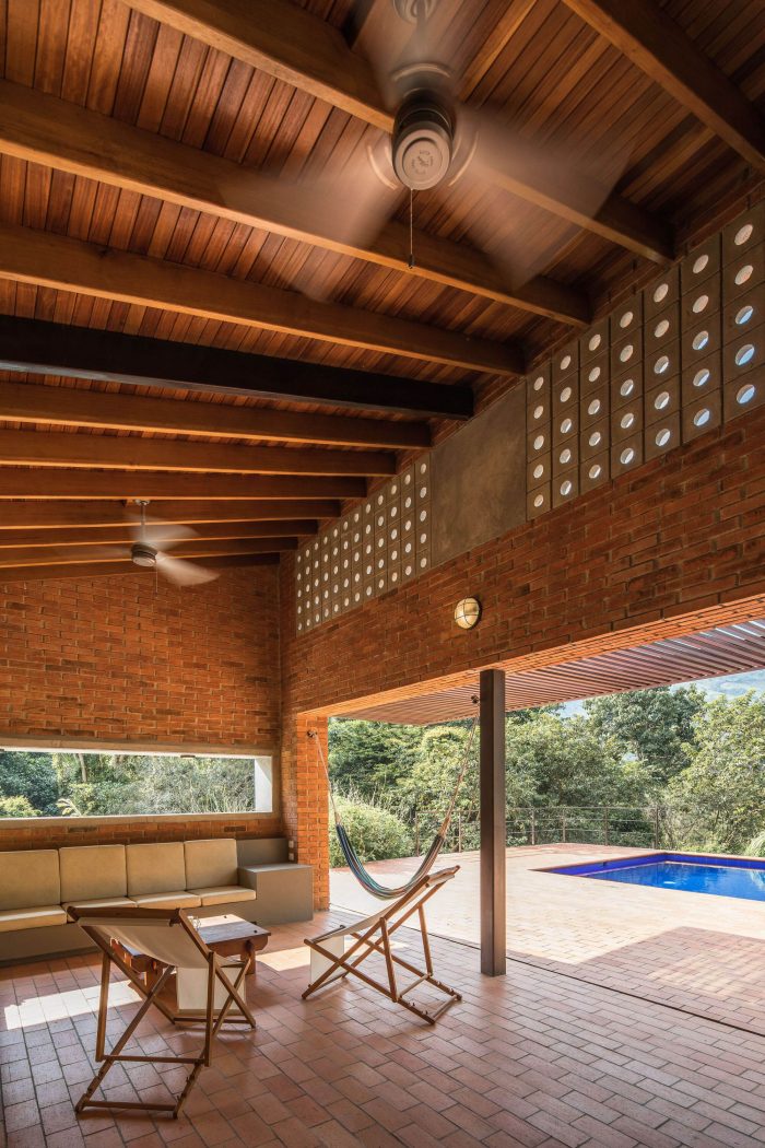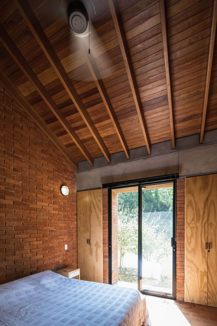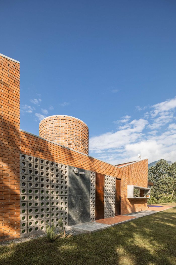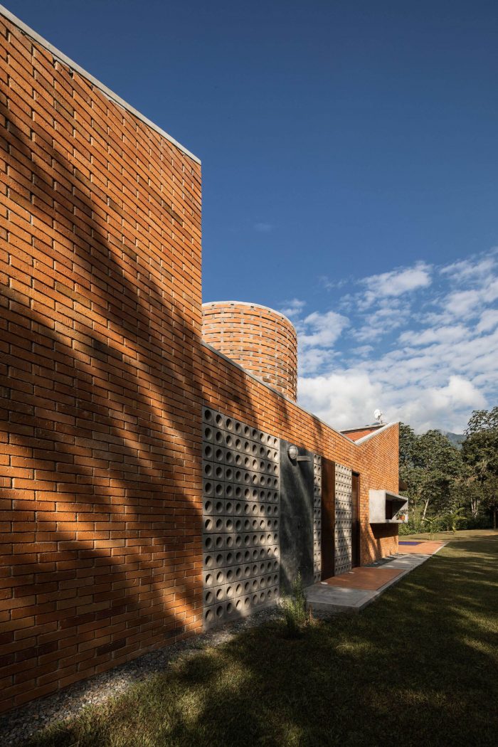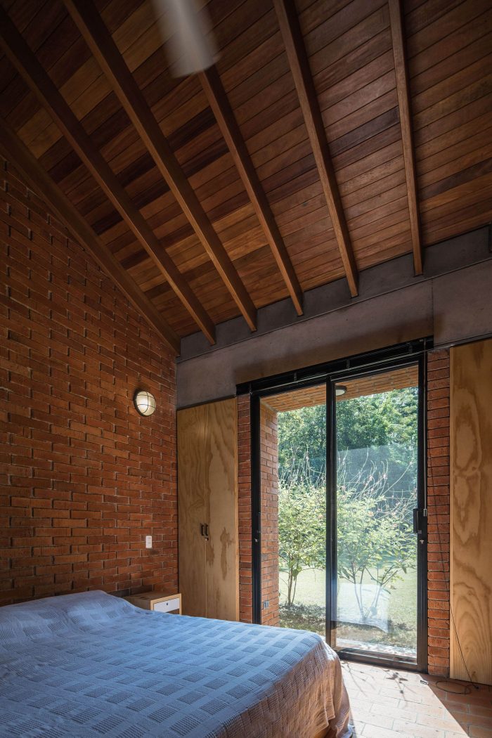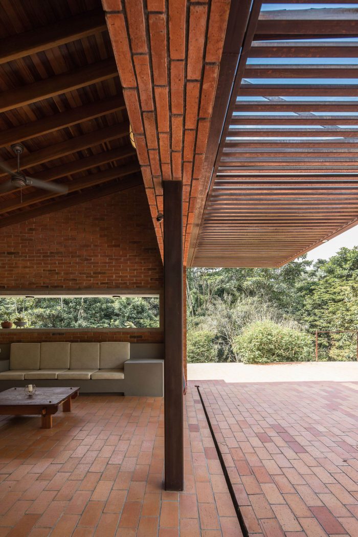 With simple materials: bricks and ceramic tiles from nearby brickyards, perforated concrete blocks, some steel columns and pergola, roof tiles, and certified native wood, the house has an appearance halfway between traditional housing construction and a small industrial building. The red colour highlights and complements the green colour of the surrounding nature.