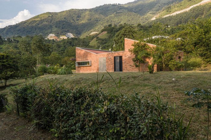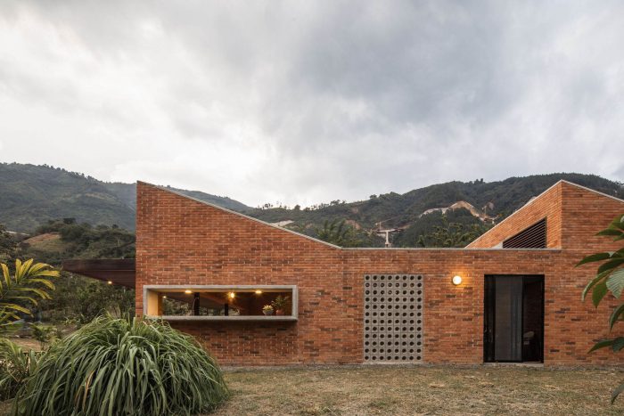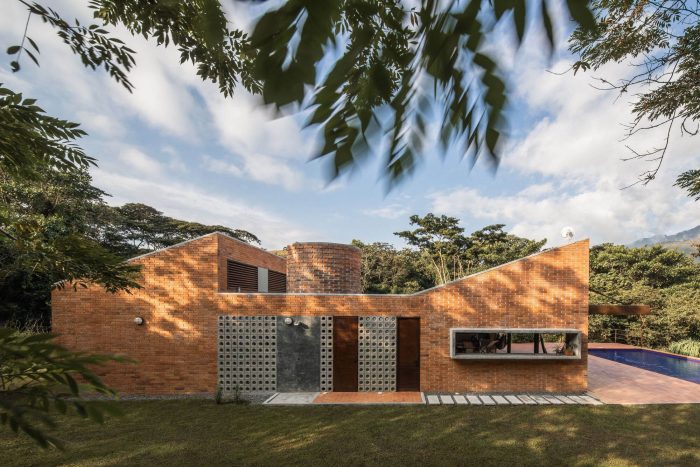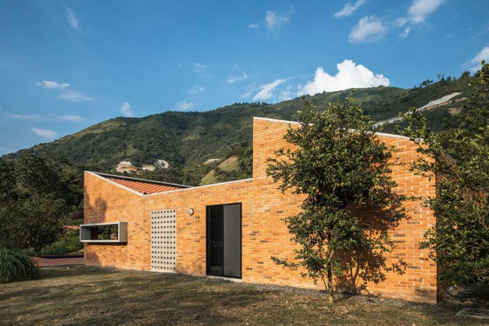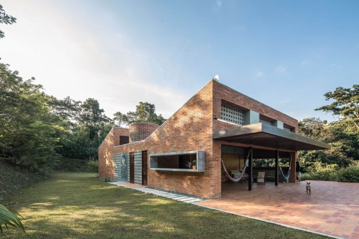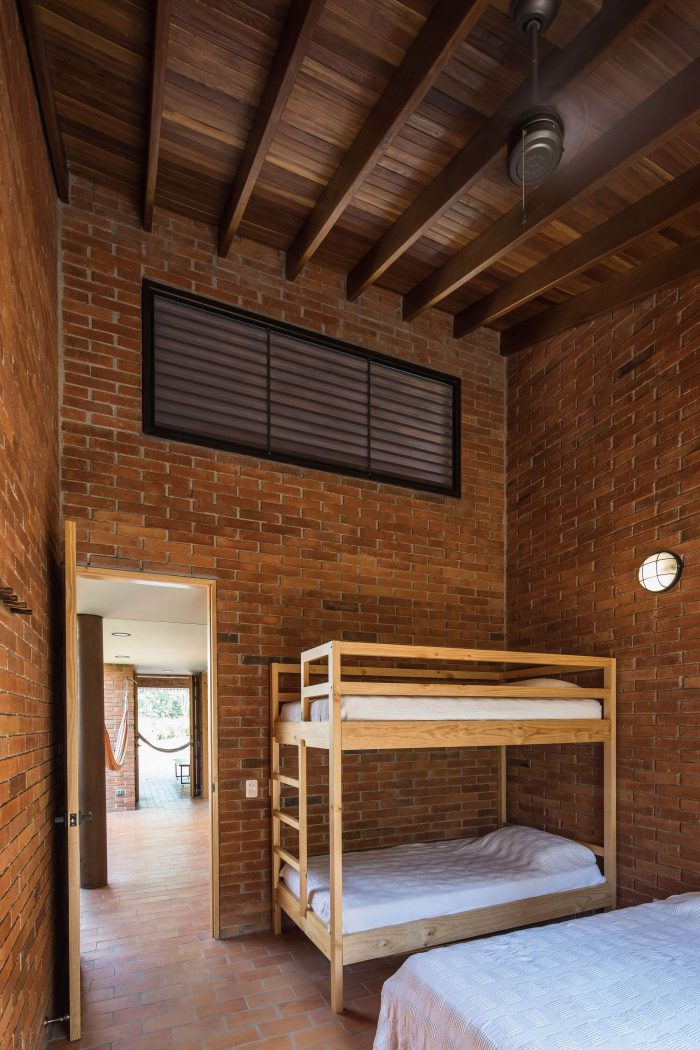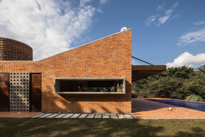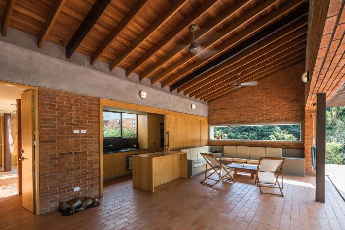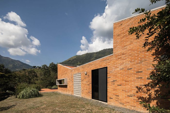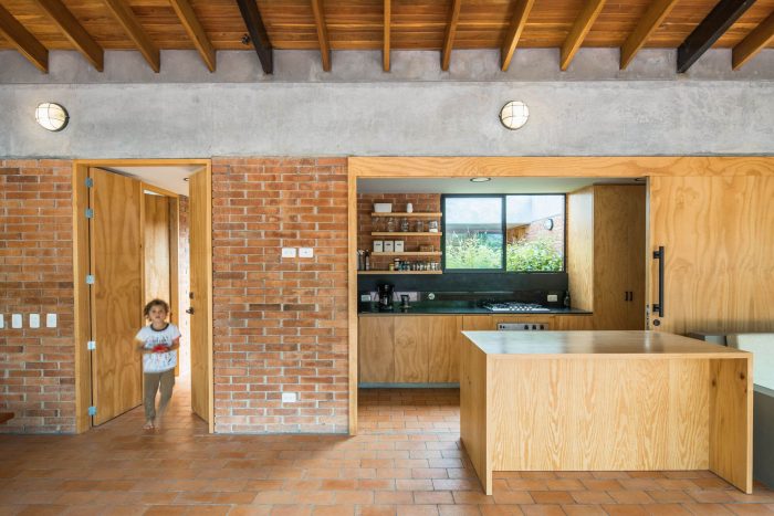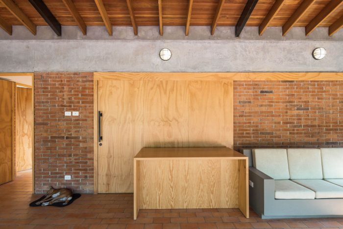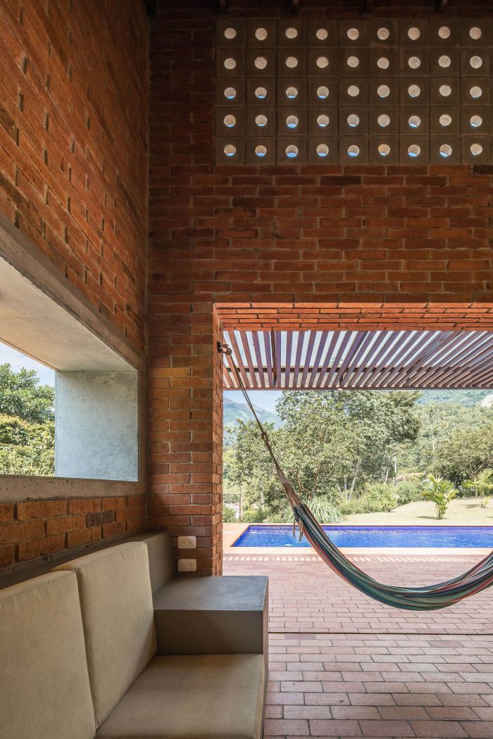 With simple materials: bricks and ceramic tiles from nearby brickyards, perforated concrete blocks, some steel columns and pergola, roof tiles, and certified native wood, the house has an appearance halfway between traditional housing construction and a small industrial building. The red colour highlights and complements the green colour of the surrounding nature.