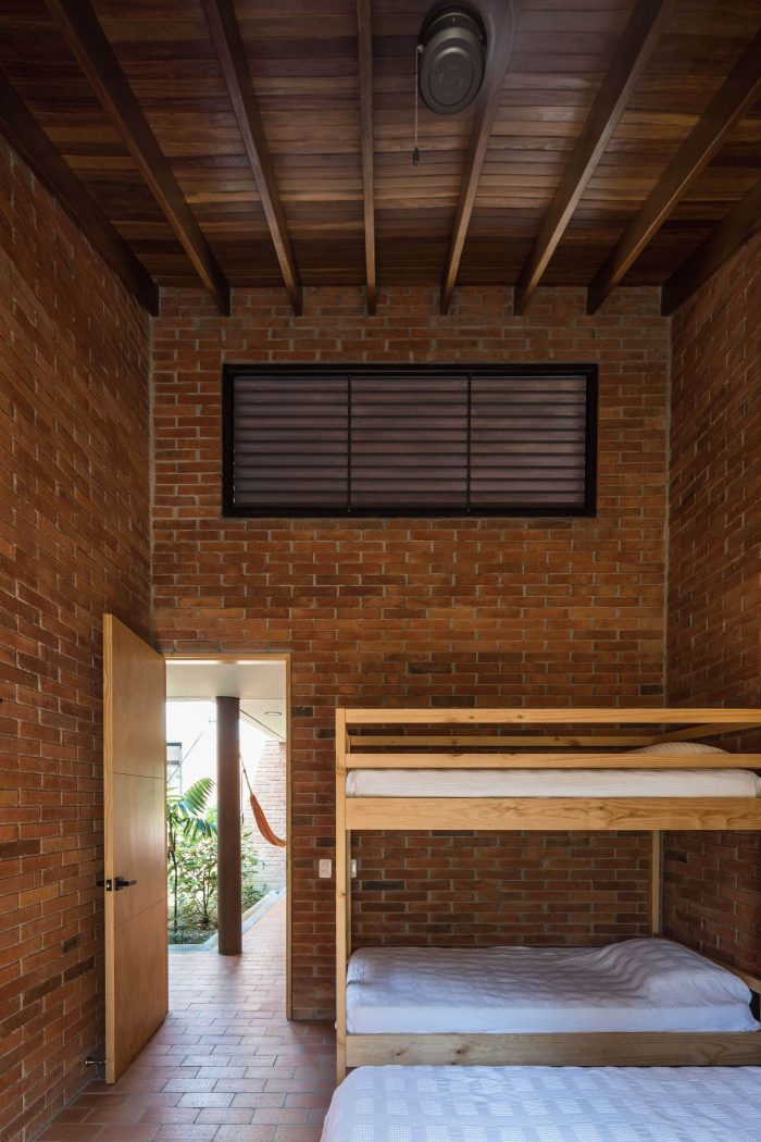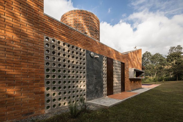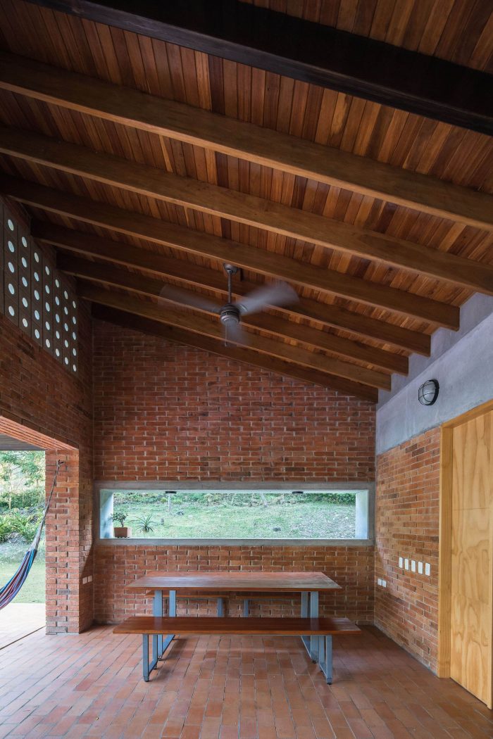房子的材料很简单:来自附近砖厂的砖和瓷砖、带孔的混凝土块、一些钢柱和凉棚、屋顶瓦片和经过认证的本地木材,房子的外观介于传统住房建筑和小型工业建筑之间。红色突出并补充了周围大自然的绿色。