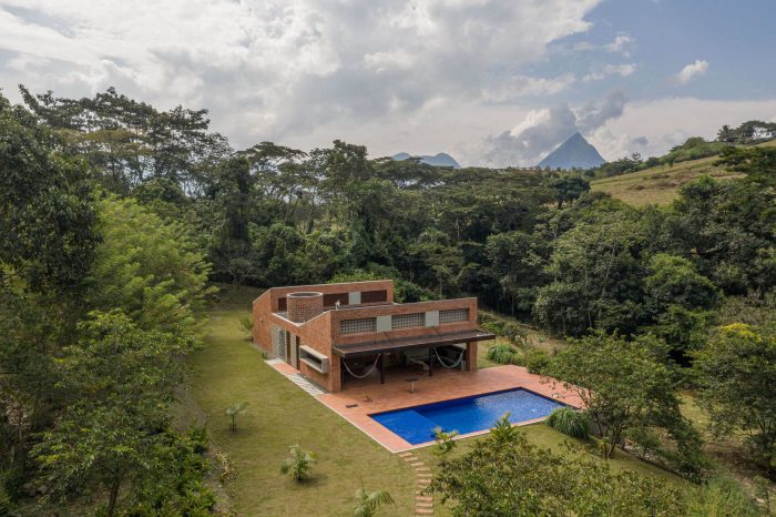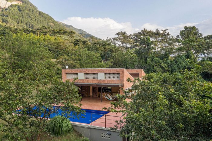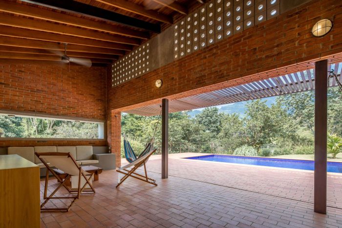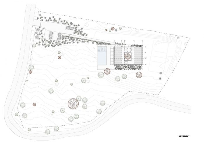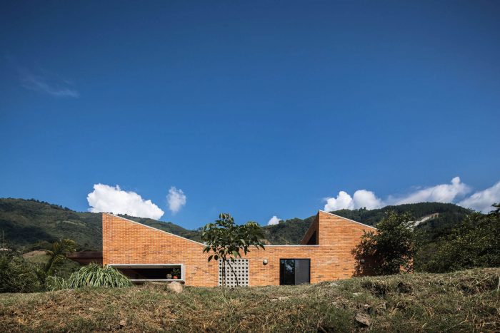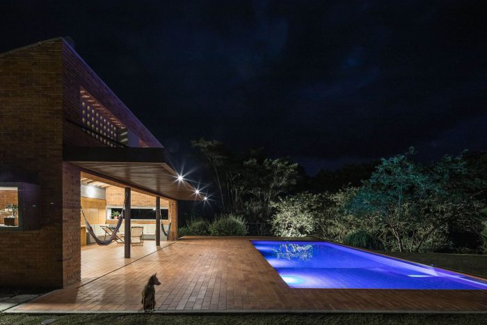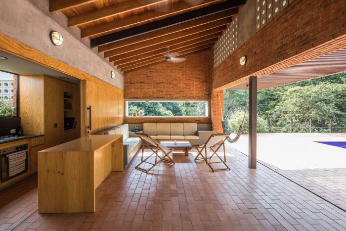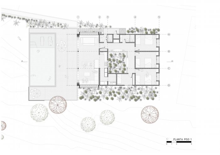 The challenge in this project was to design a compact and affordable country house with local technology and connected to the surrounding mountainous and tropical context. First, we defined the position of the house following strict setbacks regulation and taking advantage of a previously made earthwork. We located the built volume on a narrow strip of land surrounded by native forests and on the existing flat terrace. In this way, the social area faces the distant landscape to the north, and the house does not cast shadows on the pool at any time.
