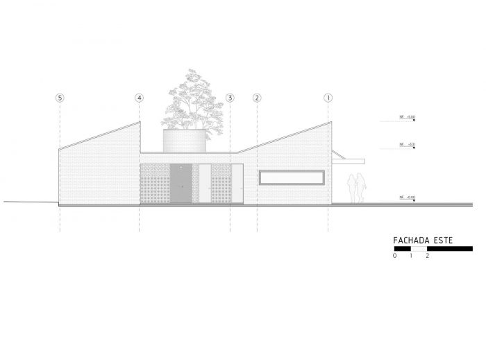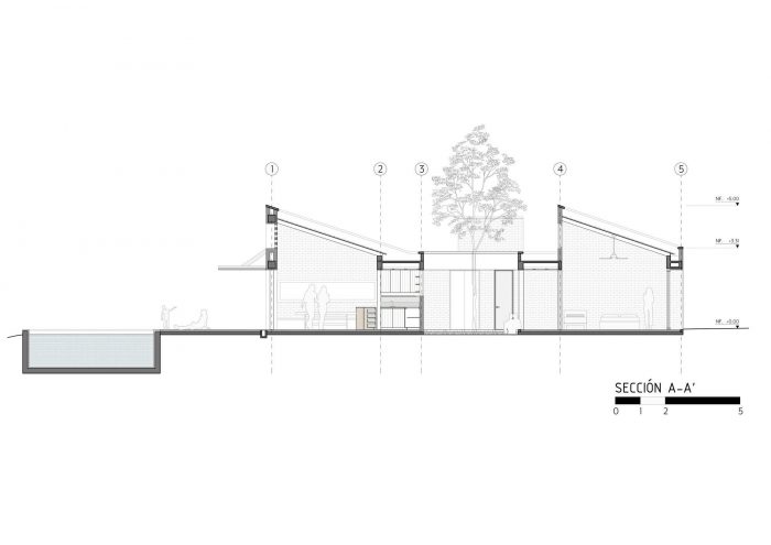 Finally, we designed the house section through two sloped and parallel roofs, the first over the living room and dining room and the second over the three rear rooms. As a whole, these roofs function like those of a small industrial warehouse, allowing natural light access, cross ventilation, and hot air outlet in the highest areas. A circular volume located at the western end houses a water reserve tank.