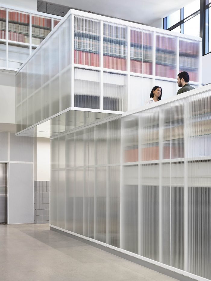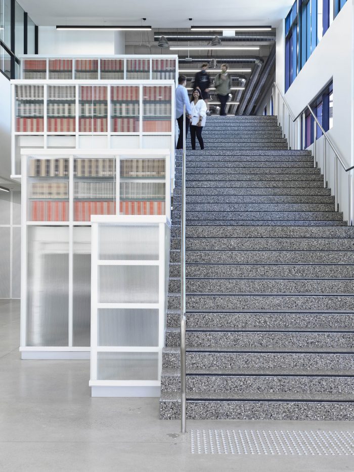 Our aesthetic approach was to leave key elements such as the existing ceiling infrastructure and vermiculite coated steel structure untouched and unadorned. The new architectural interventions were treated as installations clearly distinguishable from the shell, with autonomous objects separated from the ceiling and floating from the floor. Cascading pods adorn the grand stair from the main entry, formed by semitransparent, glass structures that house the secured book collection. Their blurred spines contribute the only colours of the space, reimagining them as artefacts surrounding the central stair that links the levels. Arrangements of clear, mirrored, and reeded glass create a kaleidoscope of reflection and transparency throughout all levels, blurring the figures of occupants as they make their way up through the interior. It felt fitting to us that a newly defined library space might literally be a reflection of itself.