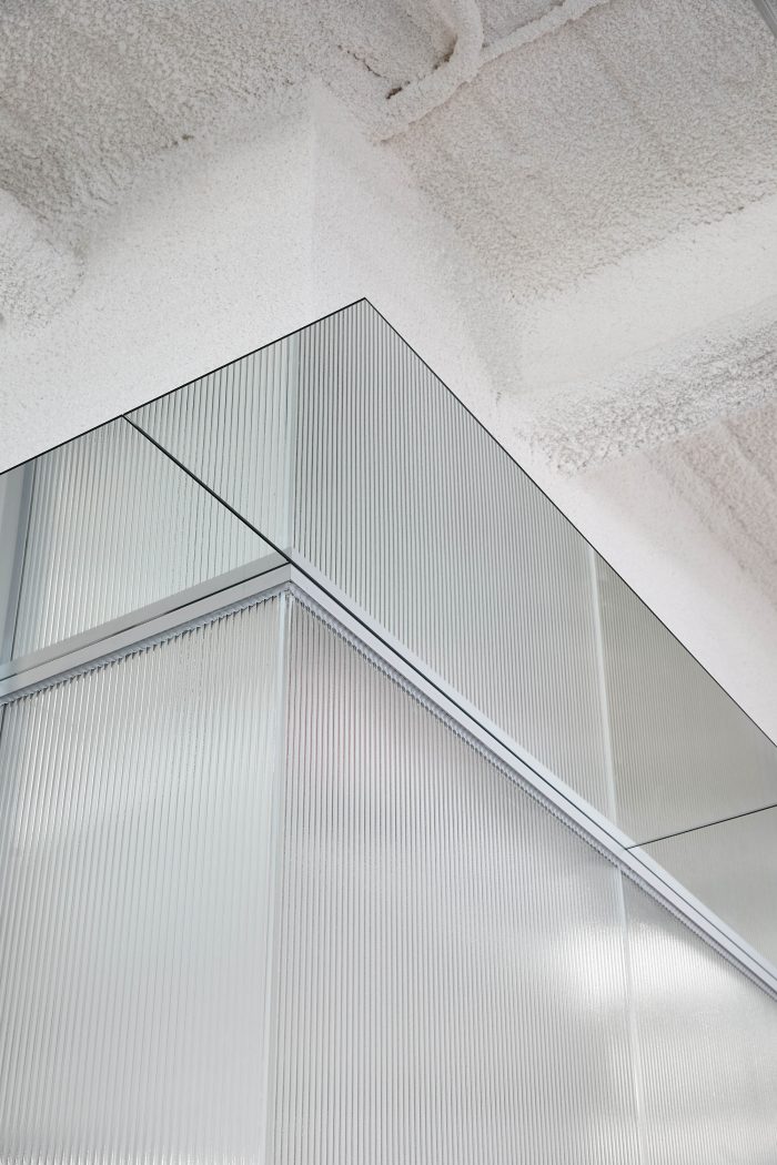 我们的审美方法是留下关键元素,如现有的天花板基础设施和涂有蛭石的钢结构,不作任何改动和装饰。新的建筑干预措施被视为可与外壳明确区分的装置,与天花板分离的自主物体和漂浮在地板上的物体。层层叠叠的吊舱装饰着主入口的大楼梯,由半透明的玻璃结构形成,放置着安全的图书收藏。它们模糊的脊柱为空间提供了唯一的颜色,将它们重新想象成围绕着连接各层的中央楼梯的艺术品。透明的、镜面的和镶边的玻璃排列在各层创造了一个反射和透明的万花筒,模糊了居住者的身影,因为他们在室内走来走去。对我们来说,一个新定义的图书馆空间可能真的是它自己的反射,这感觉很合适。