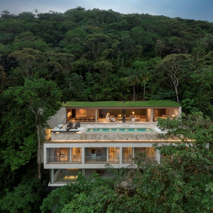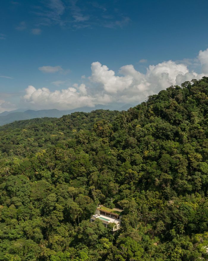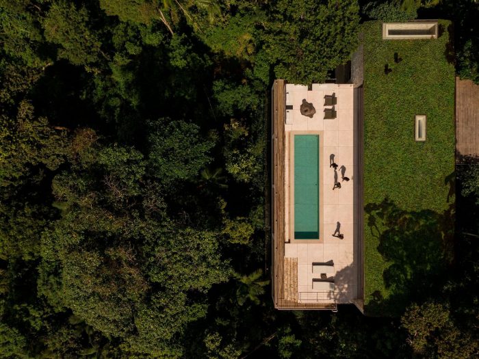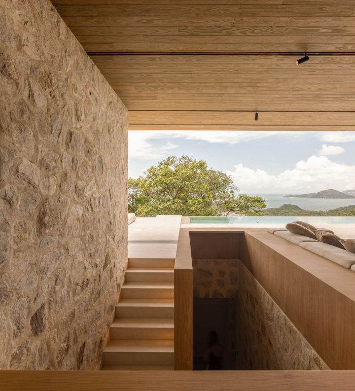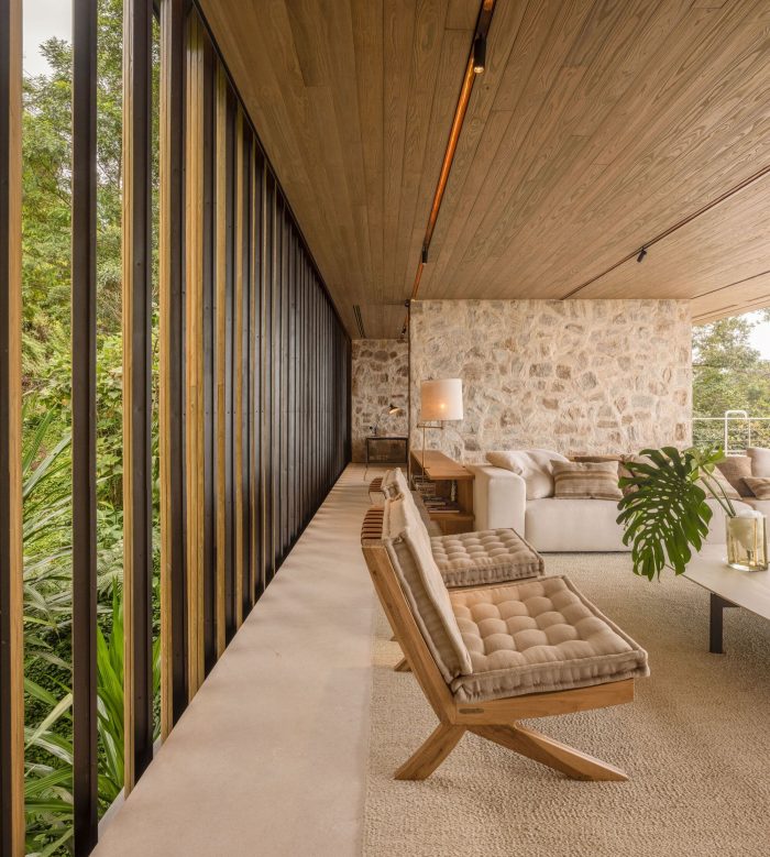 Natural stone, including all the irregular covering of the façade, and wood compose a materiality in harmony with the landscape where it is inserted and, at the same time, a counterpoint to the surrounding green massif. In the interiors, most of the furniture is by Arthur Casas, such as the fusca sofa, quilombo desk, and the coffee table square.