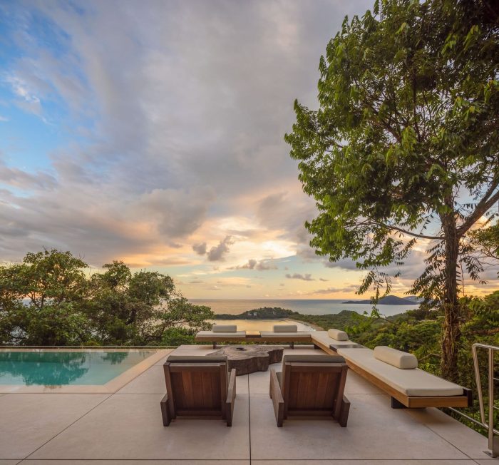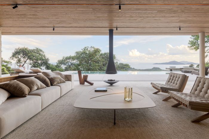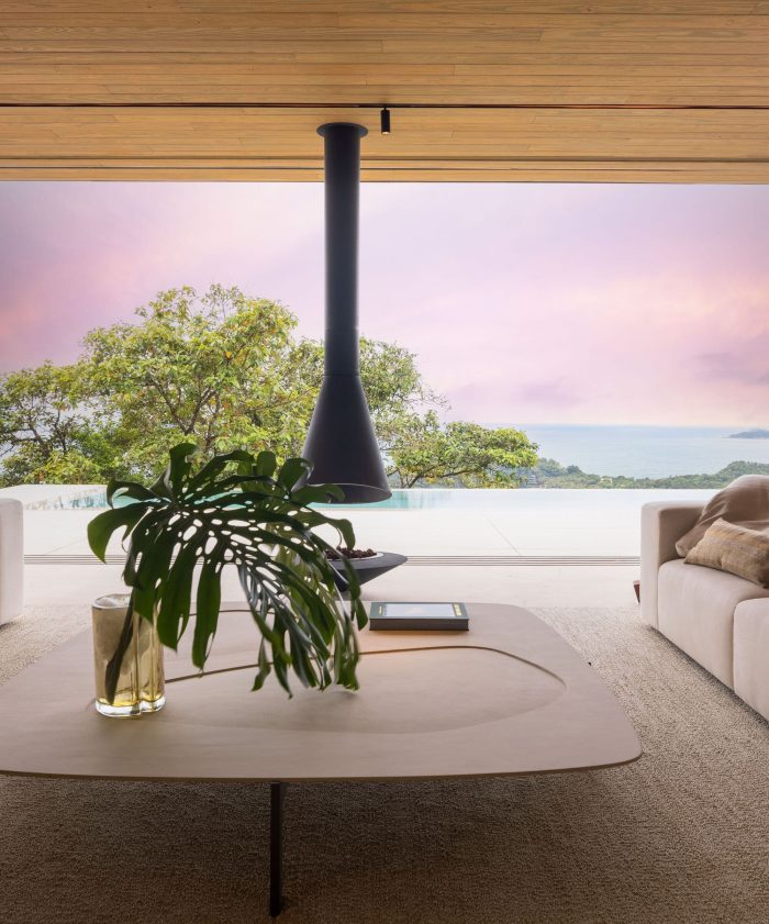 On the intermediate floor, installed at the height of the treetops, the social area with a living room integrated into the gourmet area and terrace with a swimming pool reinforces the feeling of immersion in nature. The upper floor harbors a balcony designed to provide a 180-degree view of the sea and a breeze that combines the sea breeze with the freshness of the vegetation.