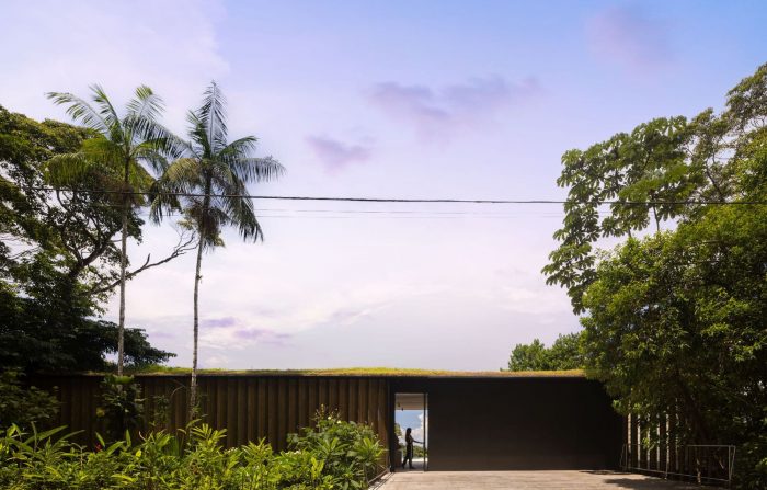 在大西洋森林中间的一块海景地块上构思的这个住宅,其规划是为了让它看起来在植被上滑行,将自己定位为一个宽阔的海洋观测站。为了实现这个想法,使用了覆盖在木头上的金属鳍,4米高,由一个 "L "形的金属结构支撑,固定在外墙的混凝土梁上。