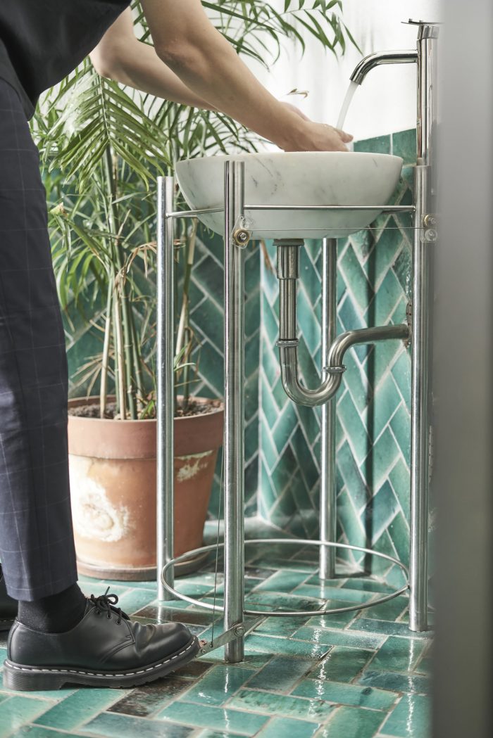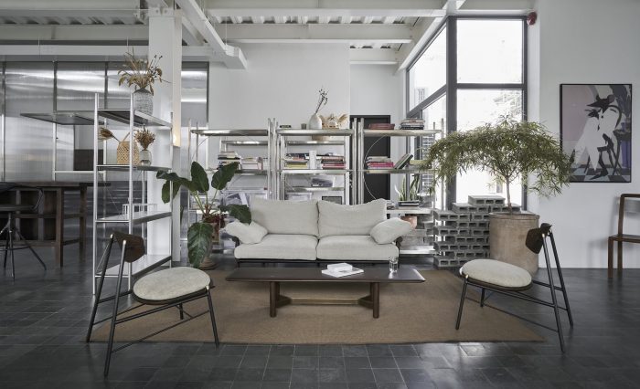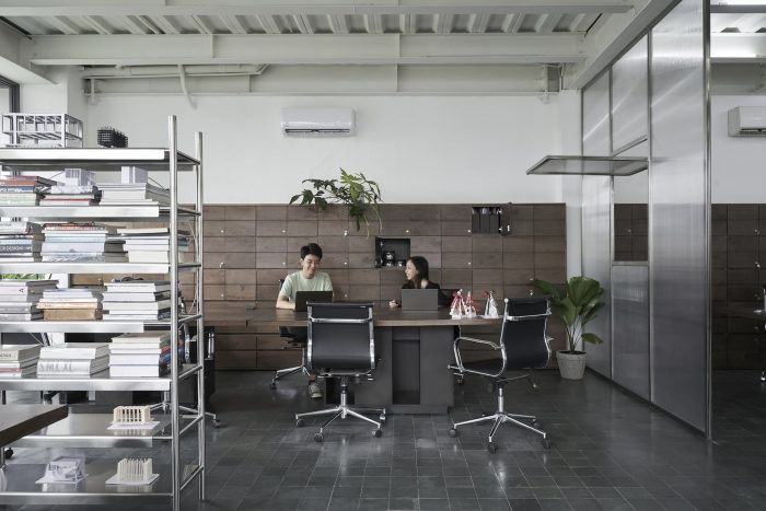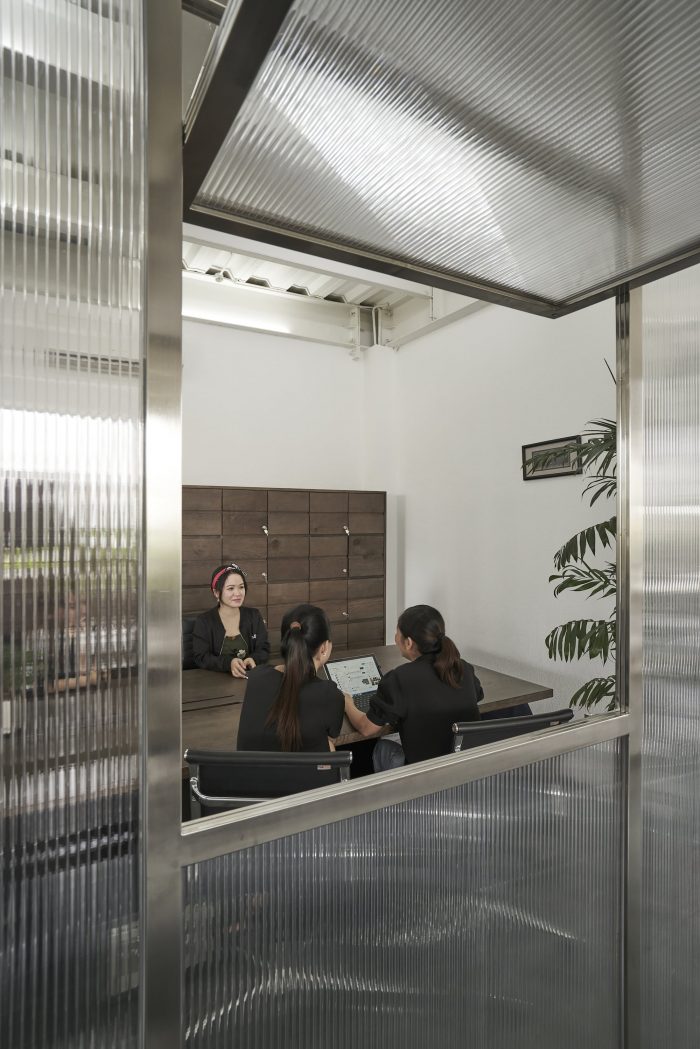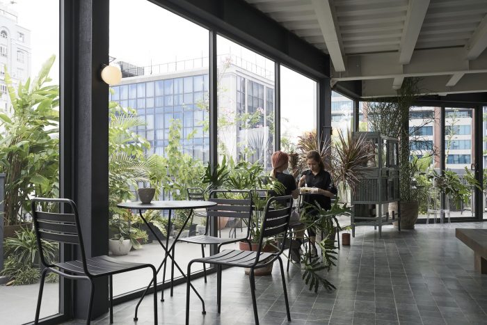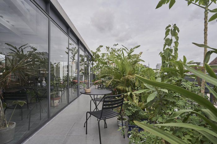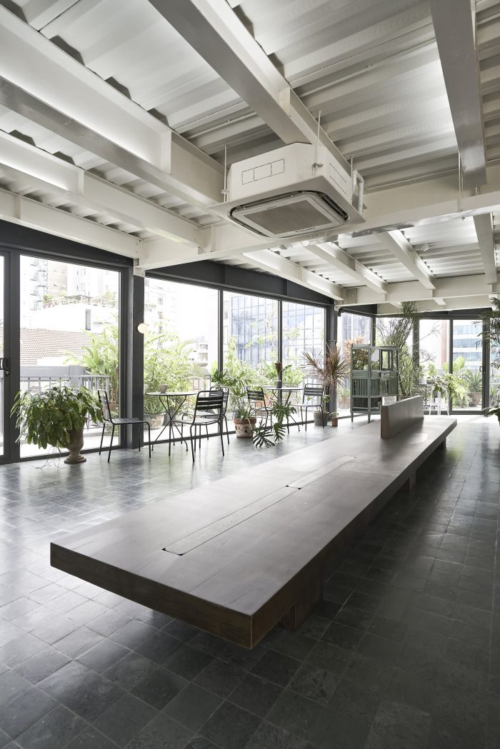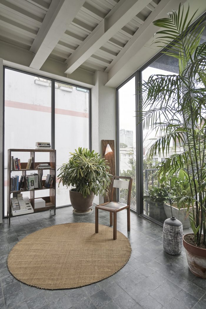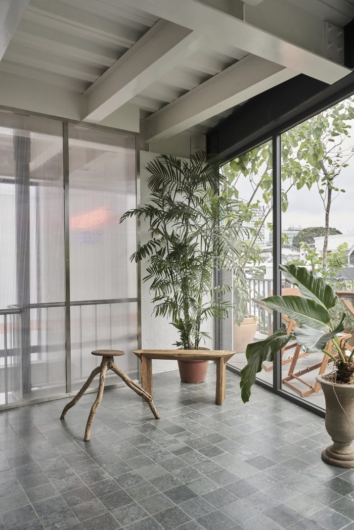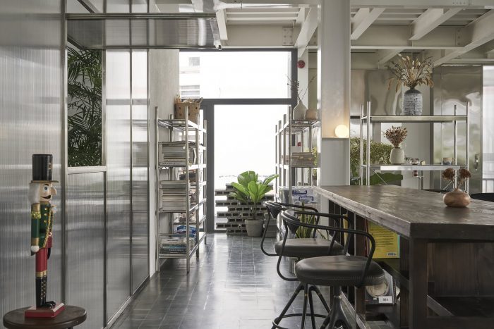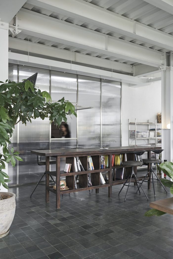 A multifunctional bench bed takes inspiration from oriental beds to lend a local touch to an otherwise contemporary setting. The team eats and plays rest on the bench. Elsewhere, curated furniture collected from friends dots the space.