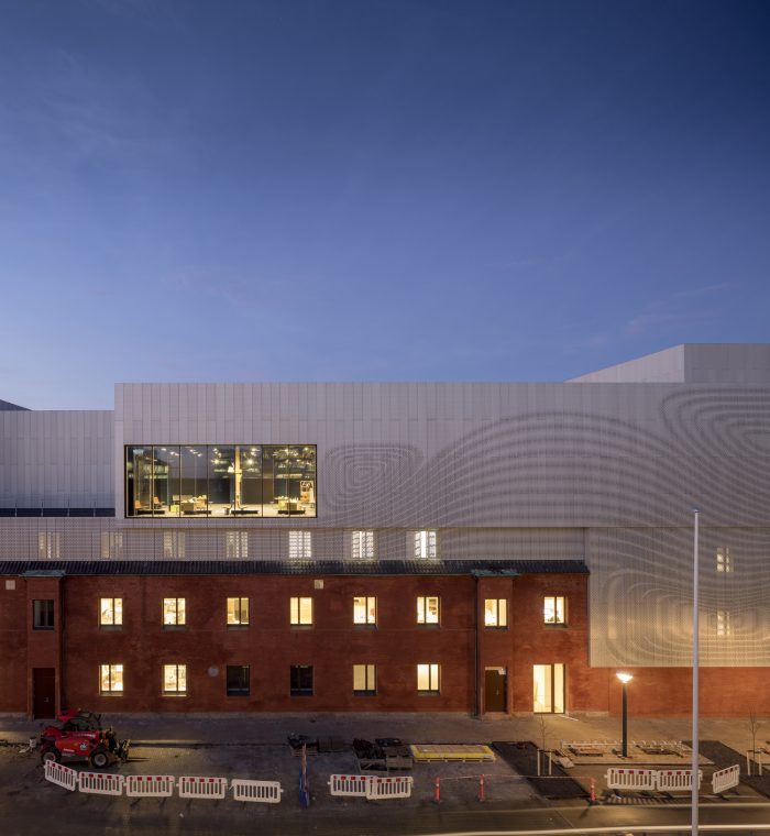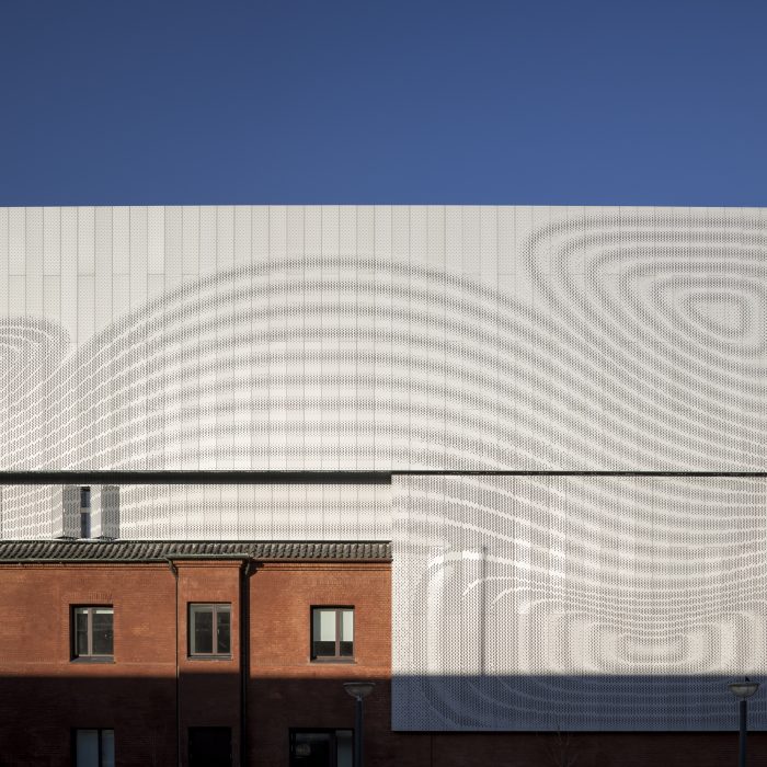 The building’s different functions are made visible to the city in the form of stacked boxes, which are offset from the base and open themselves towards their surroundings with large expanses of glass, creating a visual connection to the scientific universe inside. The boxes are clad with a lightweight façade of perforated aluminium panels, forming a contrast to the base, where the existing brickwork is preserved and emphasizes the meeting between old and new, between past and future, and between natural science and engineering. At the same time, the perforation creates a pattern that illustrates how the flow of air and fluid changes, when it meets resistance. This façade narrative is developed in a close collaboration between Experimentarium and CEBRA.
