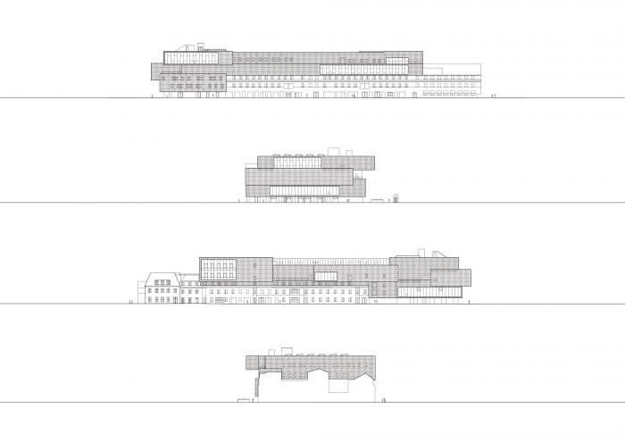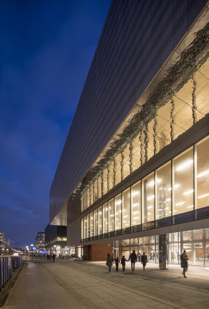 建筑物的不同功能以堆叠的盒子的形式展现在城市面前,这些盒子从基座上偏移,并通过大面积的玻璃向周围开放,创造了一种与内部科学宇宙的视觉联系。箱子的外立面采用轻质的穿孔铝板,与基座形成对比,基座上现有的砖块被保留下来,强调了新与旧、过去与未来、自然科学与工程之间的交汇。同时,穿孔创造了一个图案,说明当空气和流体的流动遇到阻力时,它是如何变化的。这个立面叙事是由Experimentarium和CEBRA紧密合作开发的。