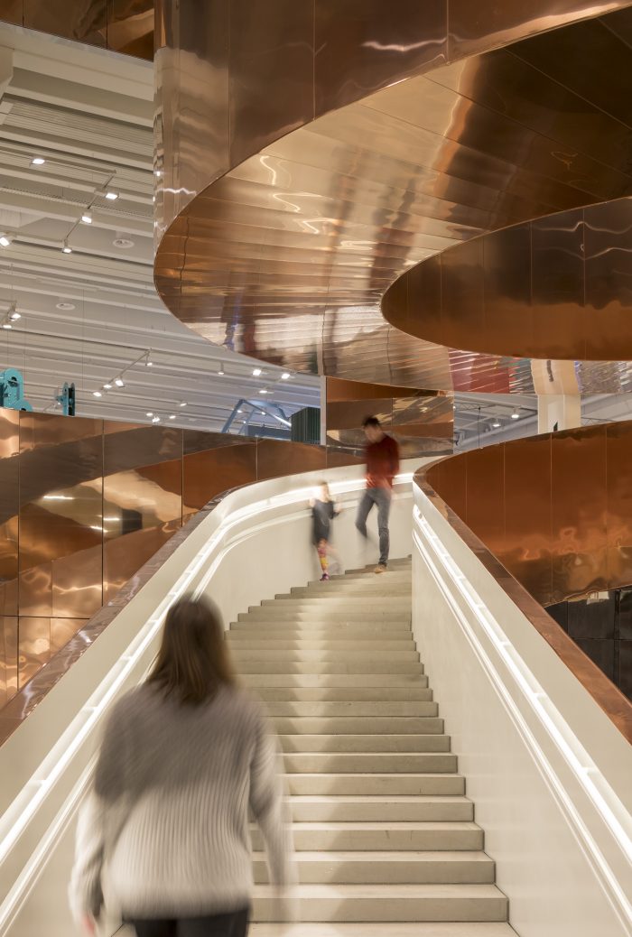 The first visitor experience is the Helix staircase that welcomes you with its radiating copper cladding as soon as you pass the entrance. Right away, it lets visitors know that they have entered a world of science.